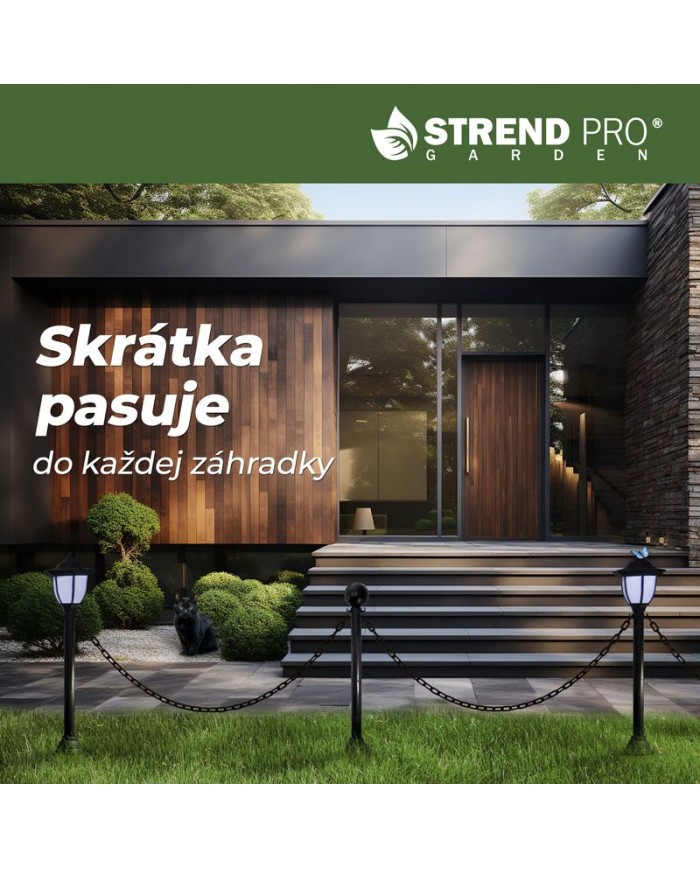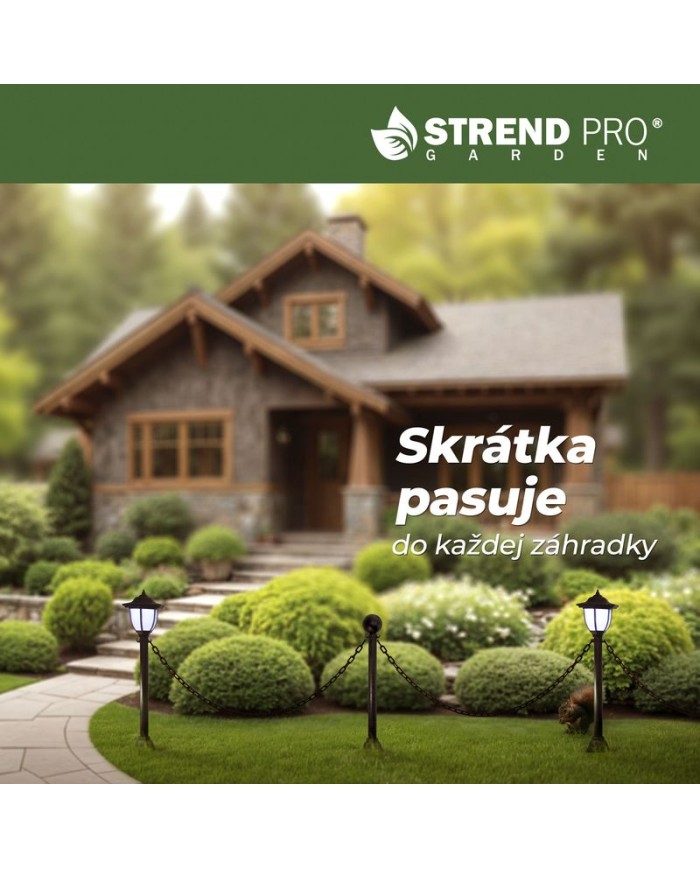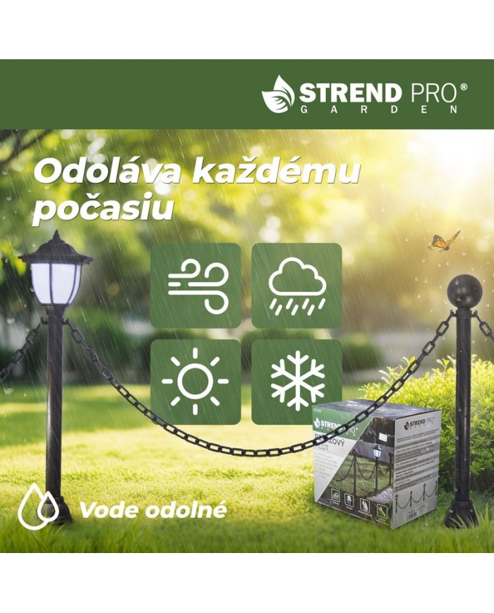 Solárny reťazový plot Strend Pro Garden je moderným doplnkom každej záhrady. Plot obsahuje 2x LED lampu a 2x stĺpik, ktoré sú navzájom prepojené reťazou. Počas dňa solárny panel konvertuje slnečnú energiu na elektrickú energiu, ktorá sa ukladá do dobíjateľnej batérie. V noci sa svetlo automatický zapne a využíva uloženú energiu. Lampa tak prostredníctvom LED diódy svieti príjemným studeným bielym svetlom. Rozmery tejto plastovej lampy sú 16,5x16,5x71,5 cm, celková dĺžka rozloženého reťazového plotu je 334 cm.