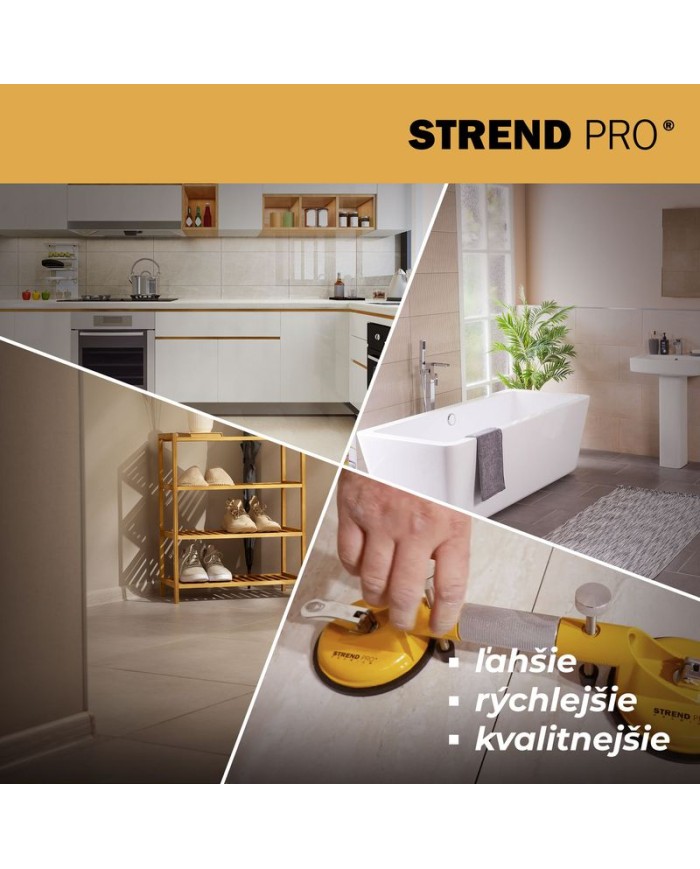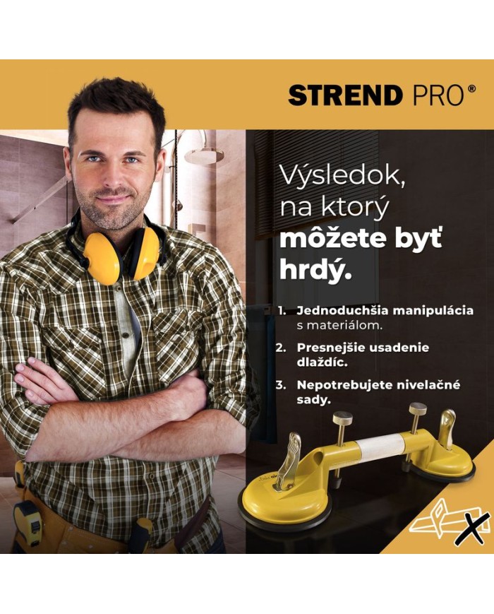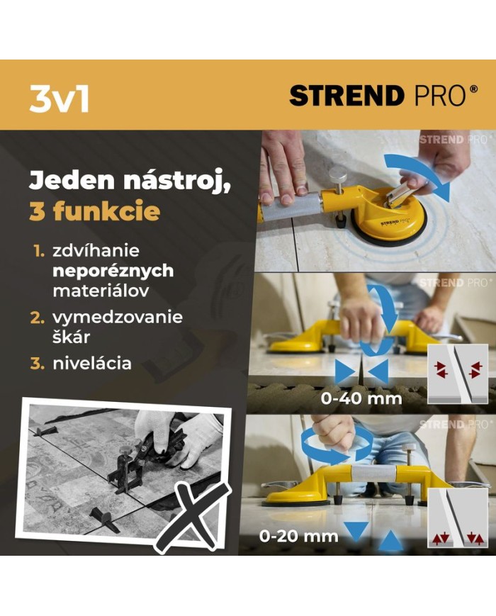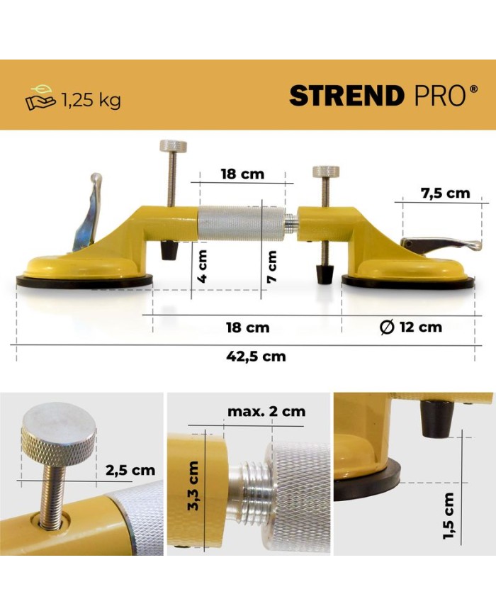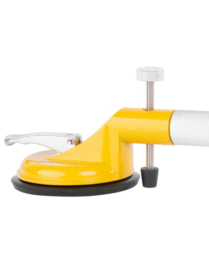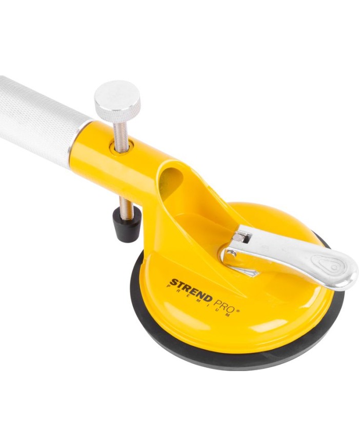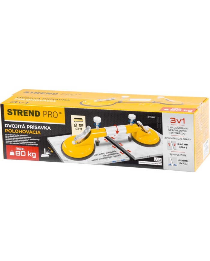 Držiak skla Strend Pro je ideálny na zdvíhanie dlažby, obkladu, skla, plastov, preglejkových panelov, kamenných dosiek a opravy karosérie. Je to skvelý3v1pomocník -na zdvíhanie neporéznych materiálov, vymedzuje škáry - prísavka umožňuje precízne posunúť dlaždice v rozsahu od 0-40 mm a nivelizuje - držiak skla je vybavený 2 skrutkami pre odstránenie výškových rozdielov dlaždíc v rozsahu od 0-20 mm. Materiál : alu+guma. Maximálna nosnosť: 80 kg.