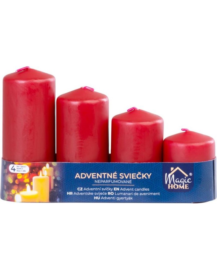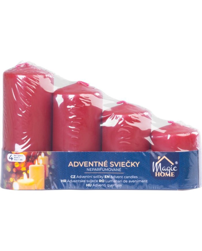 Adventné sviečky MagicHome skvele dotvoria čarovnú atmosféru Vianoc u Vás doma. Perfektne sa hodia na dotvorenie do advetných vencov či dekorácií. 4 rôzne výšky - 4,8x6 cm - váha vosku 85g, 4,8x8 cm - váha vosku 110 g, 4,8x10 cm - váha vosku 140 g, 4,8x12 cm - váha vosku 170 g. Farba: bordová.