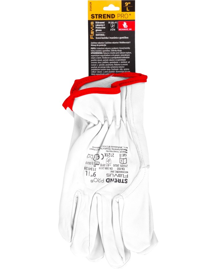 Celokožené ochranné rukavice Strend Pro Flavus sú vyrobené z lícovej kozinky. Majú voľnú manžetu s gumičkou. Šoférsky dizajn. Spĺňajú normu EN ISO 21420:2020 (cat II). Sú určené na ochranu kože pred mechanickými rizikami podľa normy EN 388:2016+A1:2018, s úrovňou ochrany 2121X. Uvedené stupne ochrany sa vzťahujú iba na dlaňovú časť nových nepoškodených a neopotrebovaných rukavíc. Úchopová schopnosť: 5. Veľkosť: 09/L. Balenie obsahuje 12 párov rukavíc.