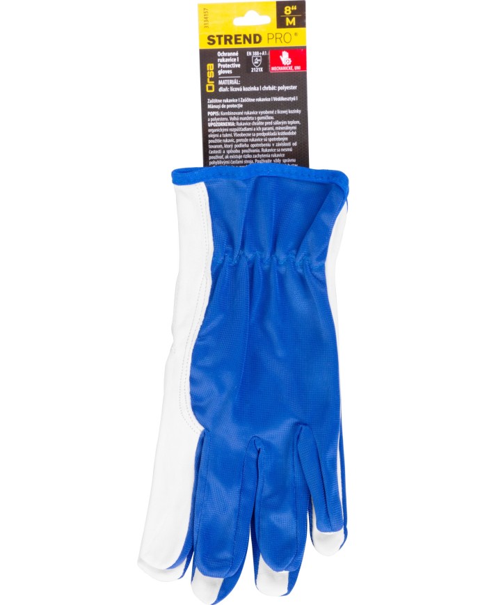 Kombinované ochranné rukavice Strend Pro Orsa majú dlaň vyrobenú z lícovej kozinky a chrbát z polyesteru. Majú voľnú manžetu s gumičkou. Spĺňajú normu EN ISO 21420:2020 (cat II). Sú určené na ochranu kože pred mechanickými rizikami podľa normy EN 388:2016+A1:2018, s úrovňou ochrany 2121X. Uvedené stupne ochrany sa vzťahujú iba na dlaňovú časť nových nepoškodených a neopotrebovaných rukavíc. Úchopová schopnosť: 5. Veľkosť: 08/M. Balenie obsahuje 12 párov rukavíc.