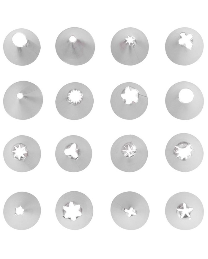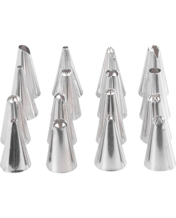 Zdobiace špičky sú určené do bavlnených, plastových alebo jednorázových igelitových vrecúšok. Skvele sa hodia na zdobenie krémov, zmrzliny, peny či krémového pečiva. Sú vhodné do umývačky riadu. V balení nájdete 16 ks špičiek s rôznymi vzormi zdobenia. Vyrobené z nerezu.