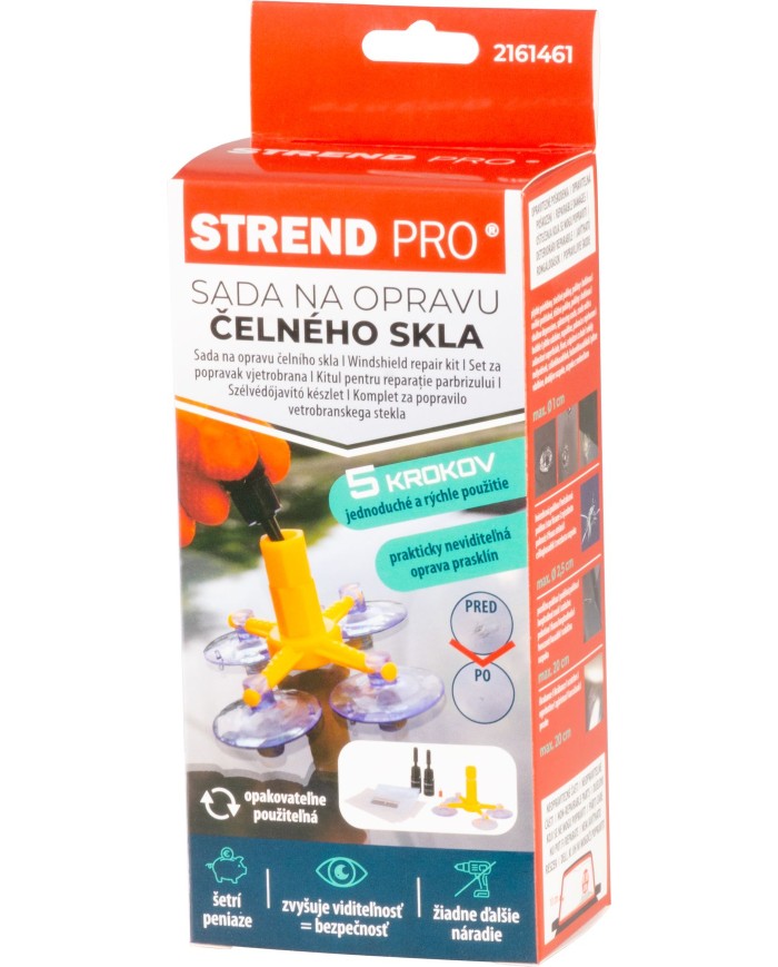 Táto sada na opravu čelného skla je navrhnutá pre jednoduchú, rýchlu a cenovo dostupnú opravu drobných prasklín a poškodení. Účinne zastavuje ďalšie praskanie skla, znižuje pnutie v mieste praskliny a zvýšuje viditeľnosť a bezpečnosť. Vďaka vysoko účinnému priehľadnému roztoku je oprava takmer neviditeľná. Roztok sa vytvrdzuje na priamom slnku za 15-20 minút alebo s použitím UV svetla už za 3-5 minút.