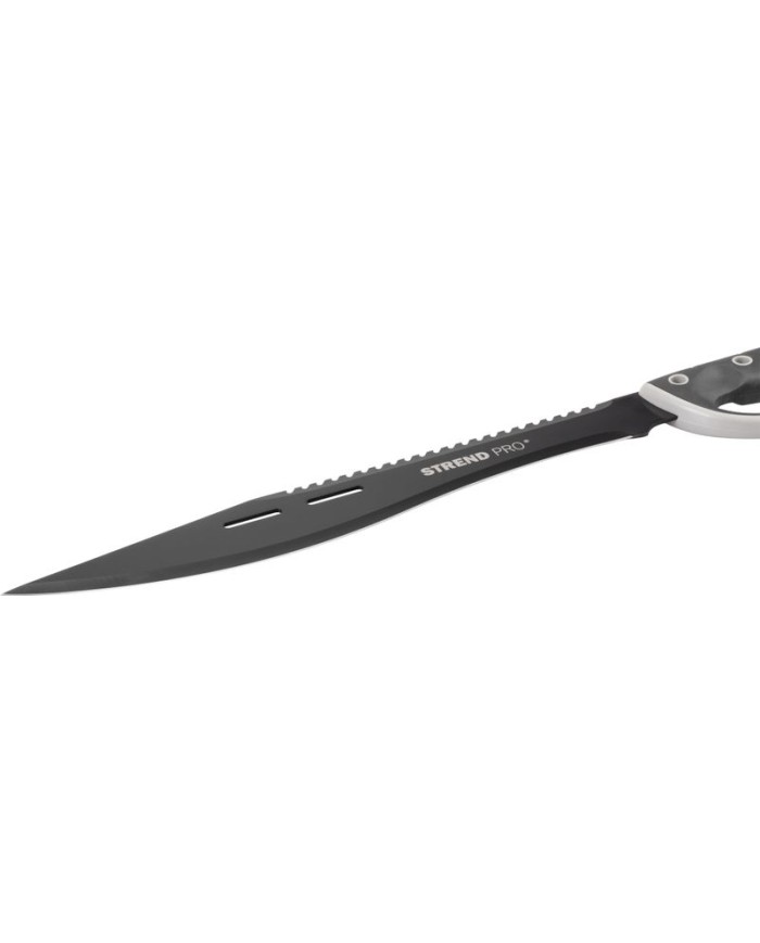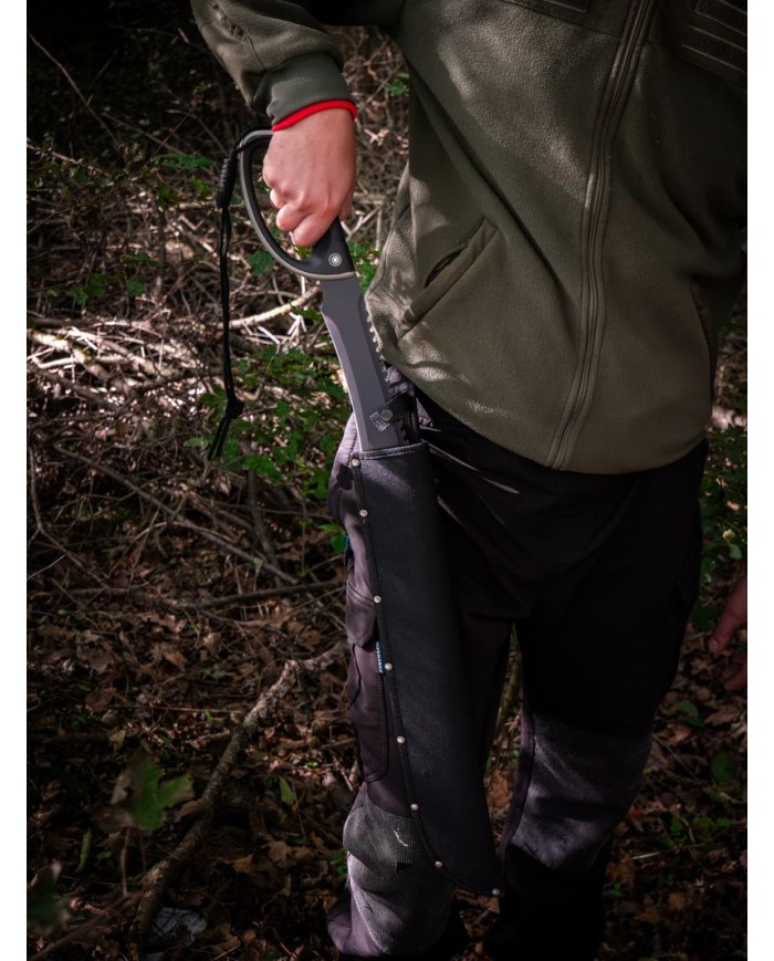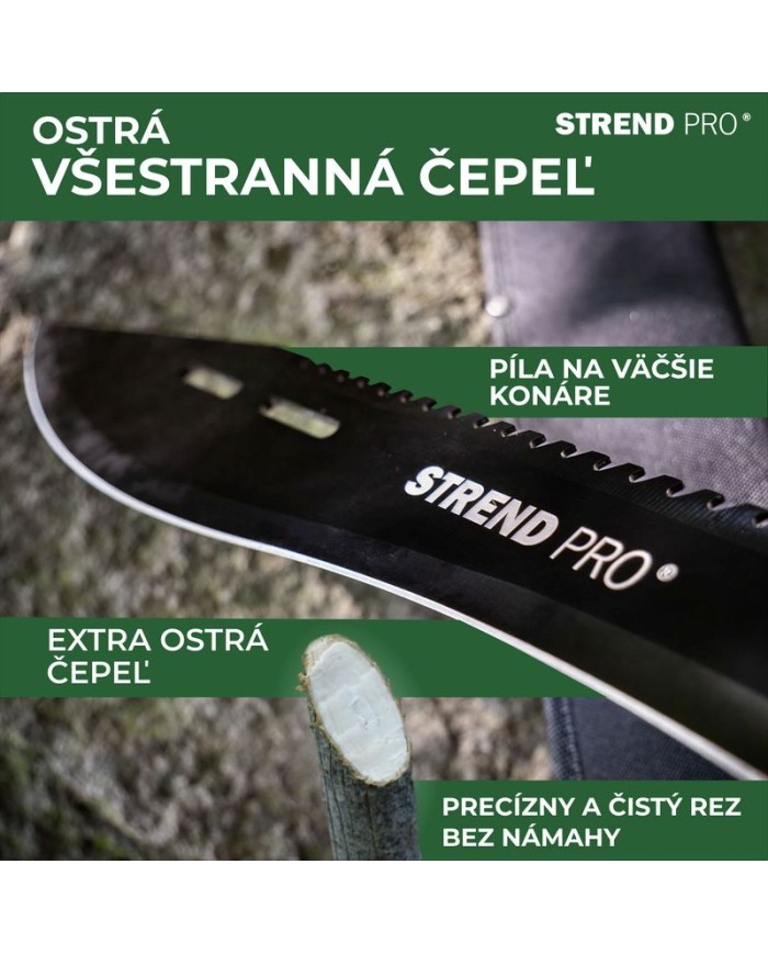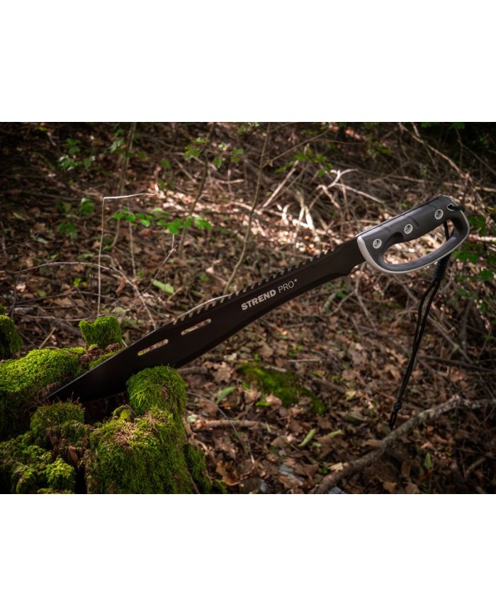 Mačeta Strend Pro Tactical pre všetky práce v lese či na záhrade. Extra ostrá čepeľ s pílkou umožňuje presné a čisté rezy bez námahy. Komfortná rukoväť s ochranou ruky chráni pred zbytočným zranením. Disponuje praktickým putkom na zavesenie za opasok. Spolu s puzdrom s klipsom na rukoväť tak získate vhodne zabalenú mačetu na bezpečnú prepravu počas prác v lese a záhrade. Čierny náter chráni ostrie pred koróziou. Celková dĺžka mačety je 61 cm.