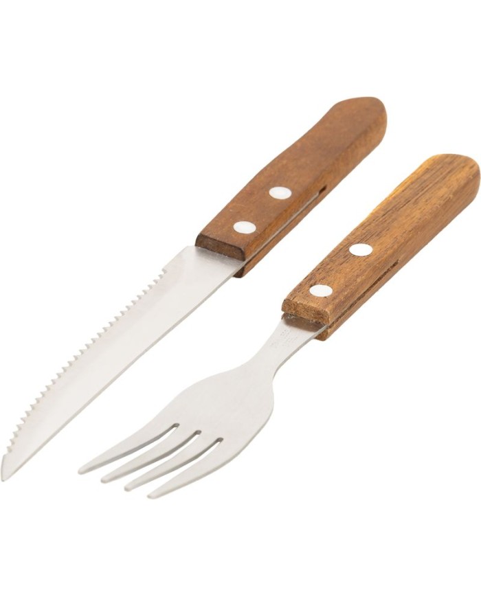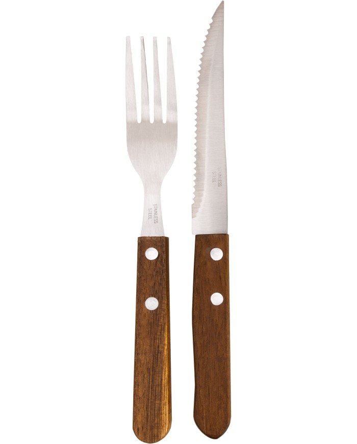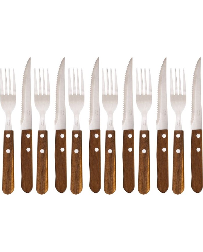 Servírovací set steakových príborov pre 6 osôb je špeciálne navrhnutý pre pohodlné rezanie steakov a iných druhov mäsa, takže ho určite oceníte Vy aj Vaši hostia na záhradných grilovačkách. Exkluzívna sada príborov obsahuje vidličky a nože najvyššej kvality, sú vyrobené z nehrdzavejúcej ocele v kombinácii s drevenou rukoväťou. Kvalitné spracovanie príborov zaisťuje dlhú životnosť. Dizajn príboru dodá Vášmu stolovaniu rustikálny vzhľad. Sada obsahuje 6x vidličiek a 6x nožov.