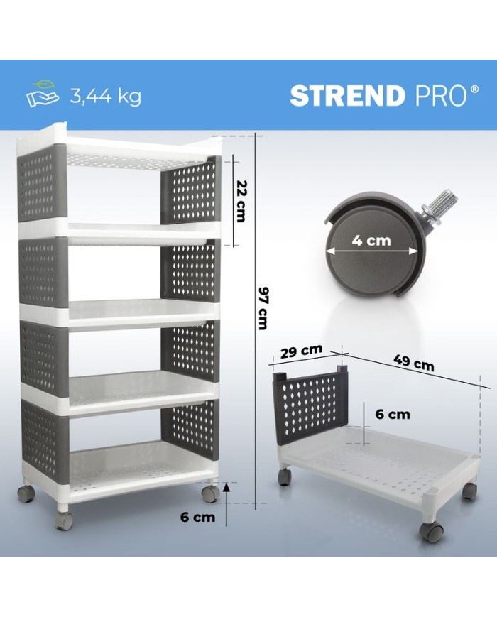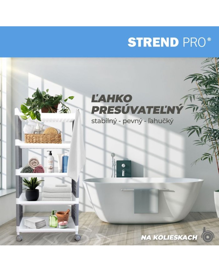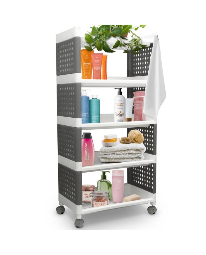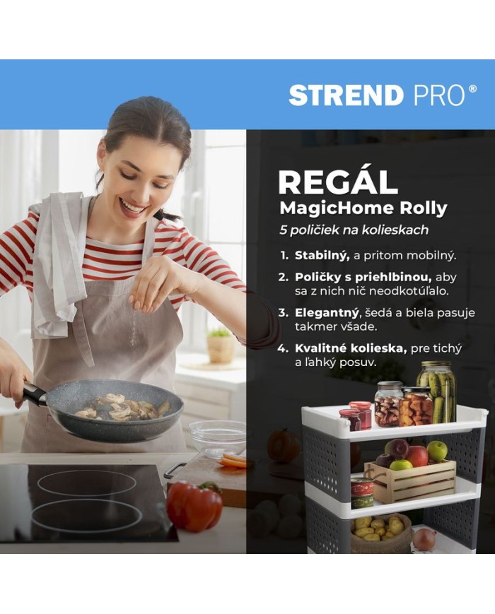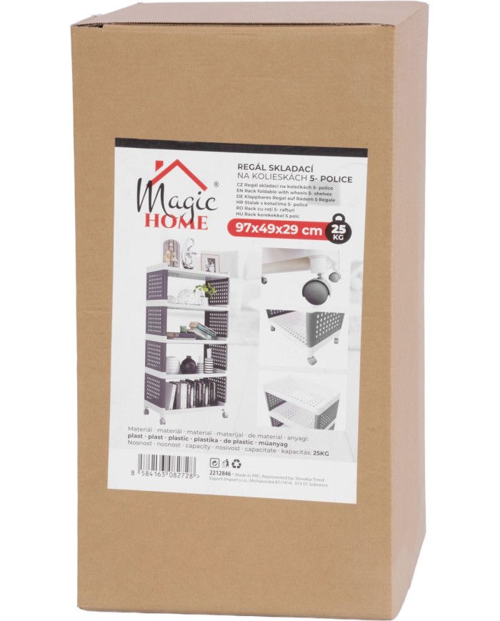Praktický regál MagicHome Rolly je perfektným pomocníkom všade tam, kde potrebujete niečo uskladniť - v kuchyni, v kúpelni, v izbe či na chodbe. Je vybavený praktickým posuvnými kolieskami na ľahšie presúvanie. Disponuje 5 policami. Maximálna nosnosť: 25 kg. Rozmery: 49x29x97 cm.