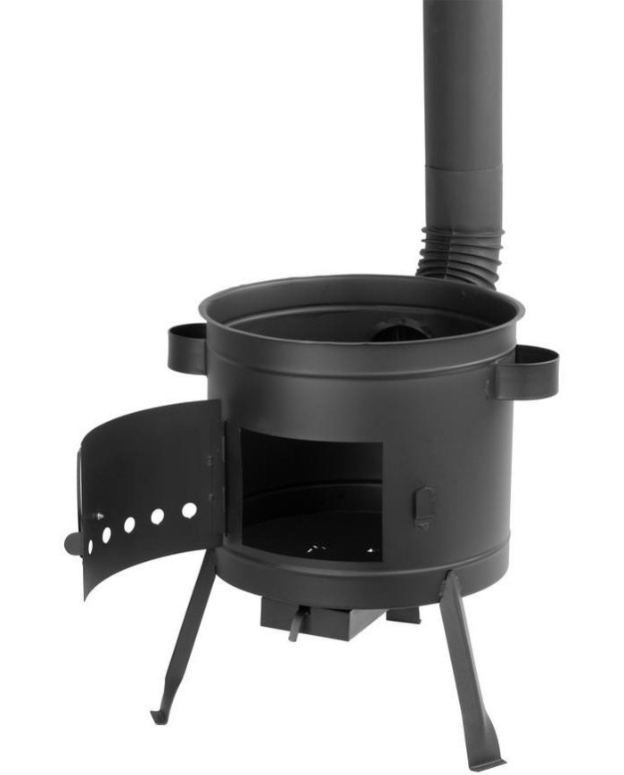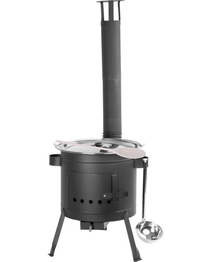 Sada obsahuje:1 ks železná Párty kotlina (priemer 42 cm, výška 56 cm) so žiaruvzdorným náterom, železná nádoba na popol - 1 ks dvojdielny železný dymovod s priemerom 10 cm, železná strieška, železné koleno - 1 ks nerezový kotlík 22 litrový, 1 ks nerezová pokrievka - 1 ks nerezová naberačka a 1 ks drevená varecha .