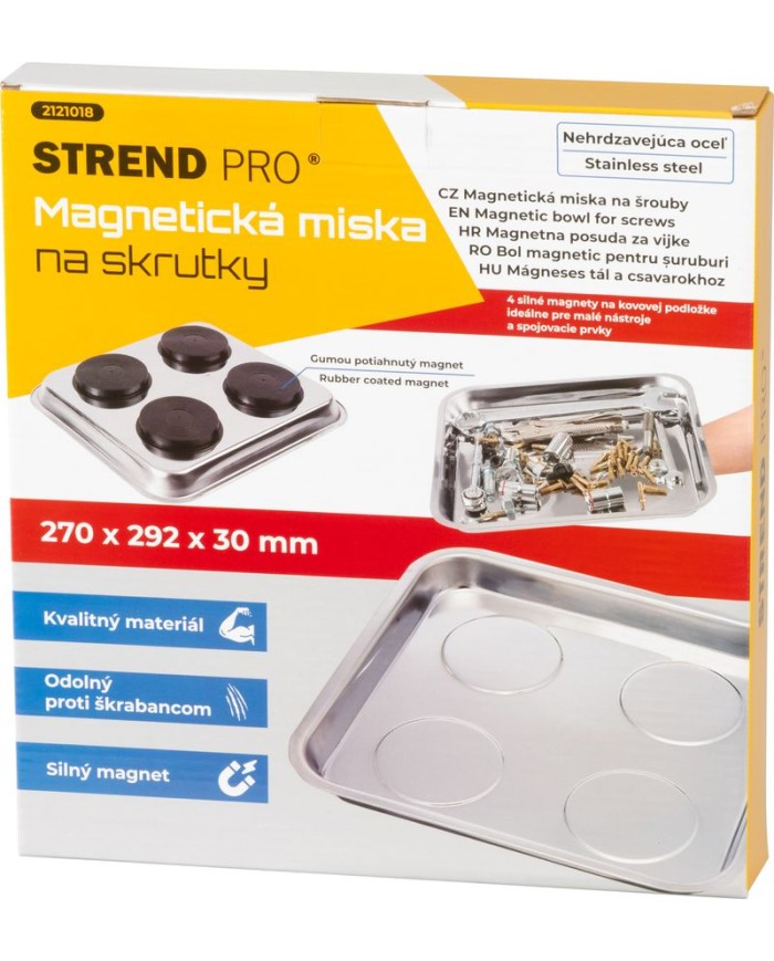 Magnetická miskaStrend Proje spoľahlivým pomocníkom pre dielne, autoservisy či montážne pracoviská. Vďakaštyrom silným magnetom s gumovým poťahomna spodnej strane bezpečne drží na kovových povrchoch, či už vodorovne alebo zvisle. Je vyrobená znehrdzavejúcej ocele, čo zaručuje vysokú odolnosť, dlhú životnosť a jednoduchú údržbu.