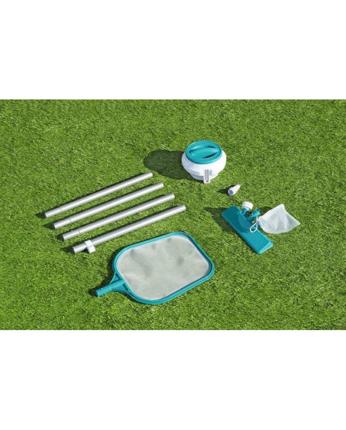 Súprava na údržbu bazéna Bestway® FlowClear™ 58794 zahŕňa ľahkú tyč s vymeniteľným vysávacími a skimmerovými hlavami. Chemický plavák so zabudovanou rukavicou na manipuláciu s chemikáliami a teplomerom, dávkuje až 7,6 cm / 3" chlórové alebo brómové tablety (nie sú súčasťou balenia). Testovacie prúžky 3v1 používajú systém okamžitého porovnania farieb na meranie voľného chlóru (0-10 ppm), pH (6,2 - 8,4) a celkovej alkalinity (0 - 240 ppm). Nalepovacie náplasti s plochou 42 cm2.