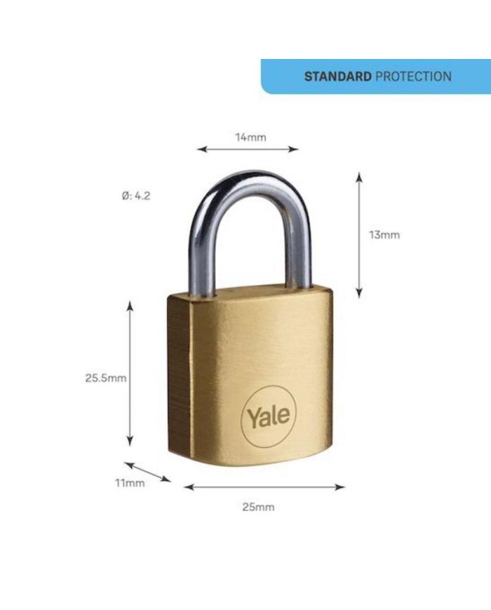 Visiaci mosadzný zámok Yale so šírkou 25 mm so štandardným stupňom zabezpečenia. Testovaný na odolnosť proti korózii až 96 hodín, aby poskytovali ochranu proti rôznym poveternostným podmienkam. Balenie obsahuje 3 kľúče.