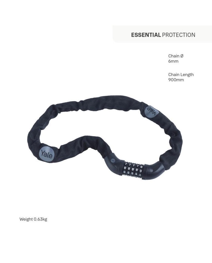 Reťazový zámok na bicykel Yale na kód. Reťaz vyrobená z uhlíkovej ocele. Odolný voči poveternostným vplyvom. Hrúbka reťaze: 6 mm. Dĺžka oceľovej reťaze: 90 cm.