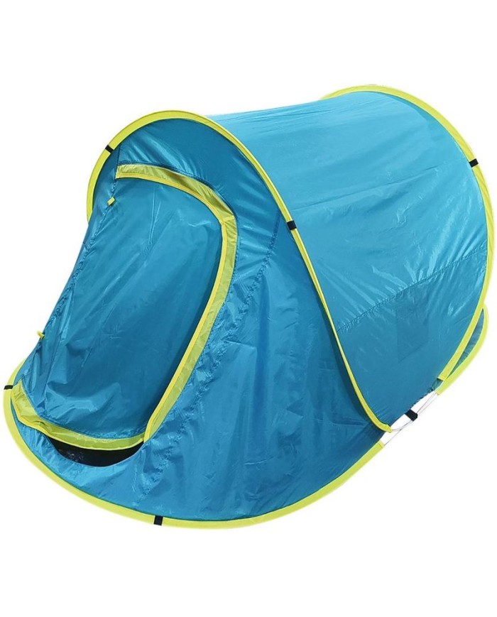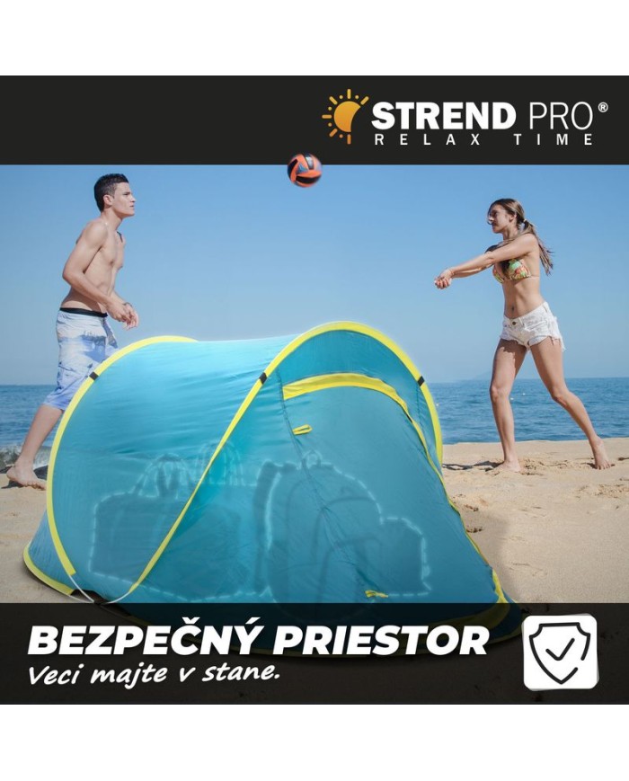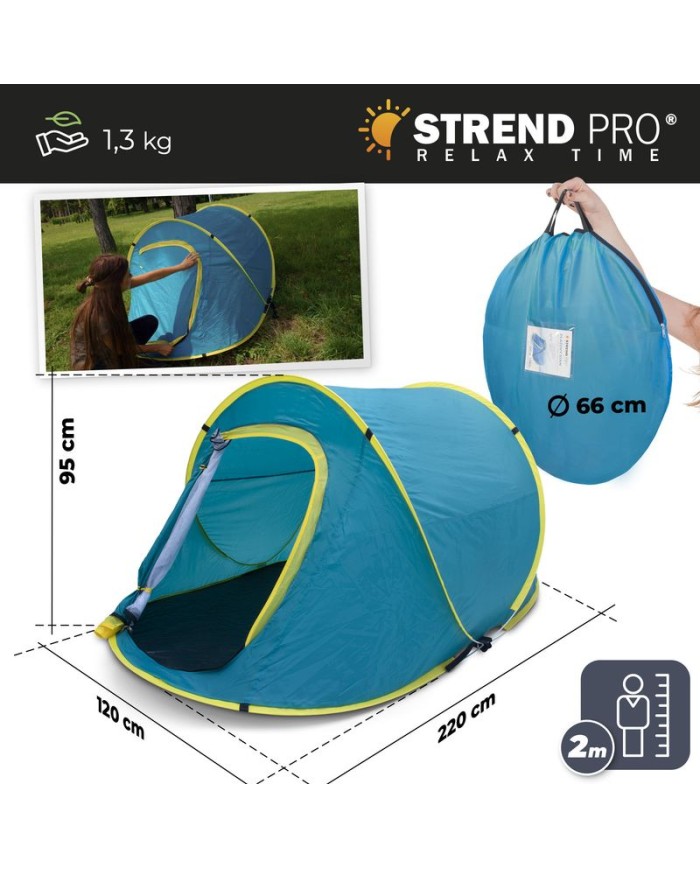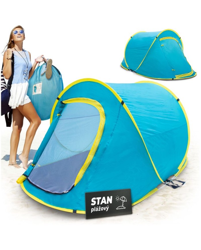 Plážový modrý stan je vhodný pre dospelých aj deti. Má prednú plachtu, ktorou sa dá stan úplne zatvoriť na zips, avšak môžete ho použiť aj bez prednej plachty. Vaše deti sa tak môžu hrať v stane a pritom ich budete mať stále na očiach. Stan je vyrobený z polyesteru odolného voči UV žiareniu a vode. Stan si udržiava pevnú konštrukciu pomocou častí spevnených sklolaminátom. Rozmery sú 220 x 120 x 95 cm.