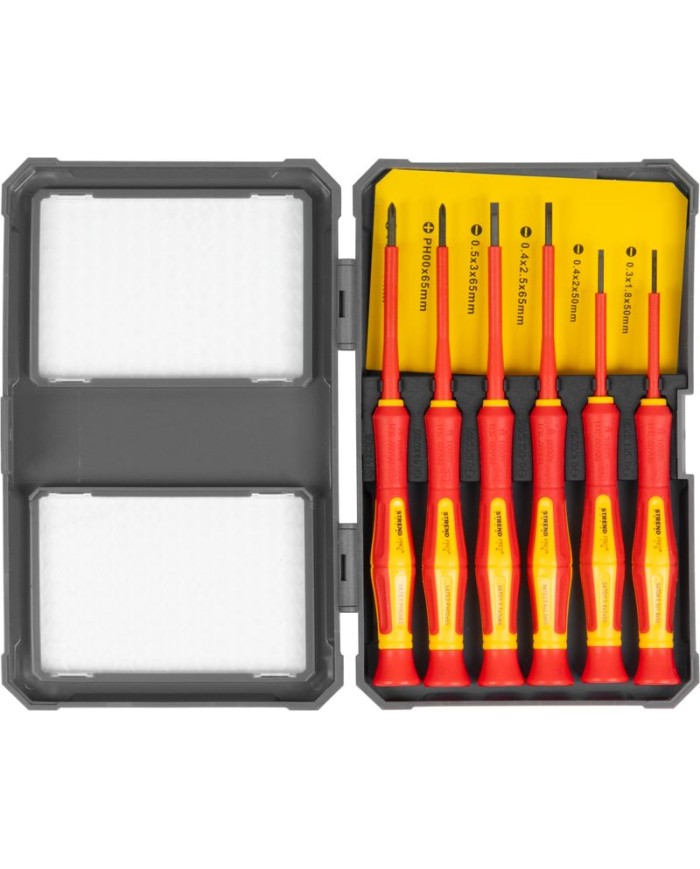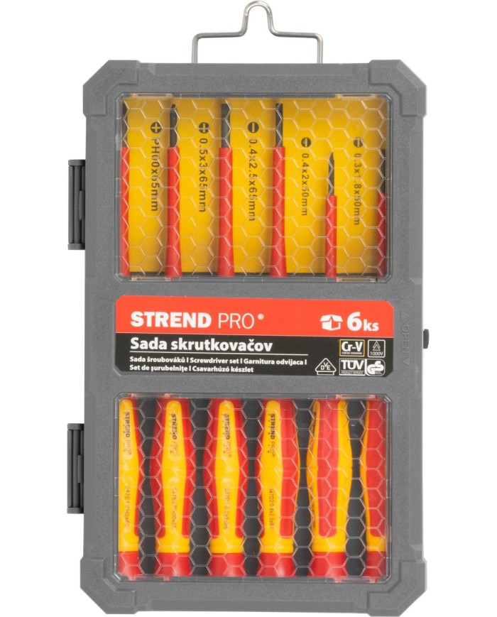 Sada skrutkovačovStrend Pro VDE, 6-dielnaje určená pre bezpečnú prácu s elektroinštaláciami. Obsahujeploché a Phillipsskrutkovače sVDE izoláciou, ktorá poskytuje ochranu pri práci.