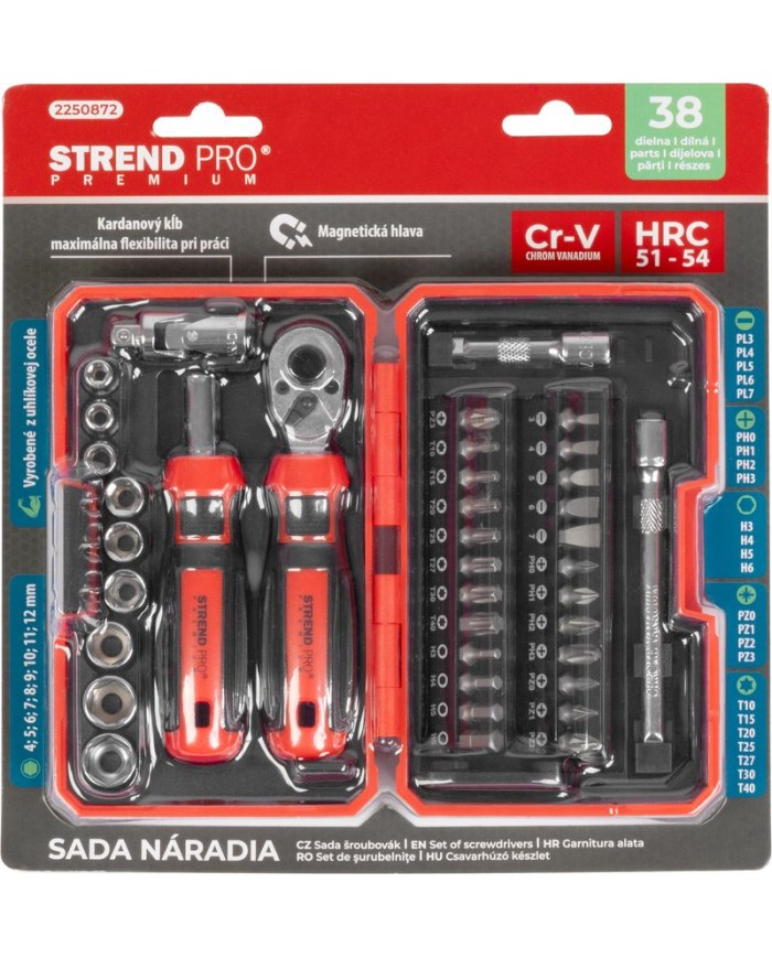 Sada skrutkovačovStrend Pro Premium, 38-dielnaje ideálnym riešením pre profesionálov aj domácich majstrov. Obsahuje široký výberTorx, plochých a Phillipsskrutkovačov, ktoré umožňujúefektívnu prácu pri montážach a opravách.