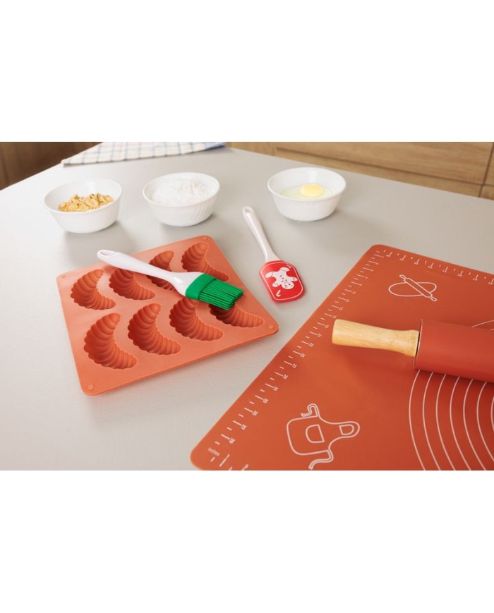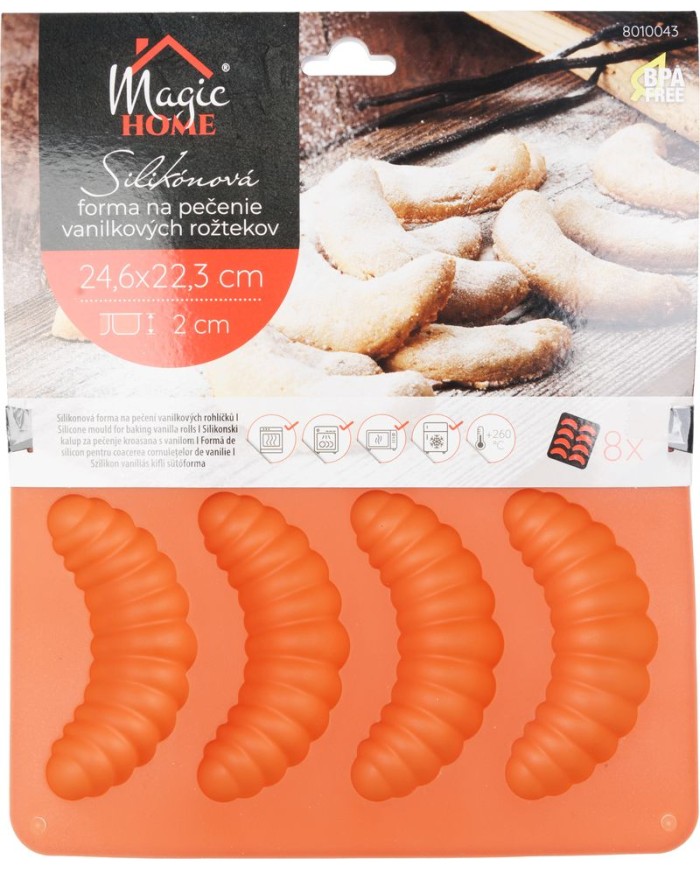 S touto praktickousilikónovou formouna pečenie vanilkových rožtekov môžete pohodlne pripraviť až8 rožtekovnaraz. Forma s rozmermi24,6x22,3 cma výškou2 cmje všestranná a vhodná pre rôzne typy rúr – mikrovlnné, elektrické, teplovzdušné aj plynové.