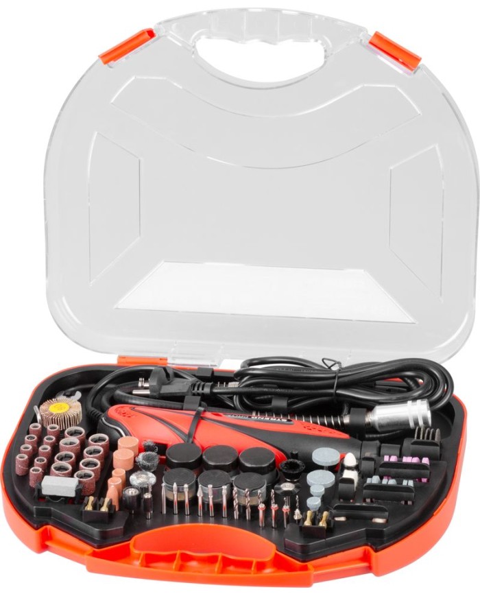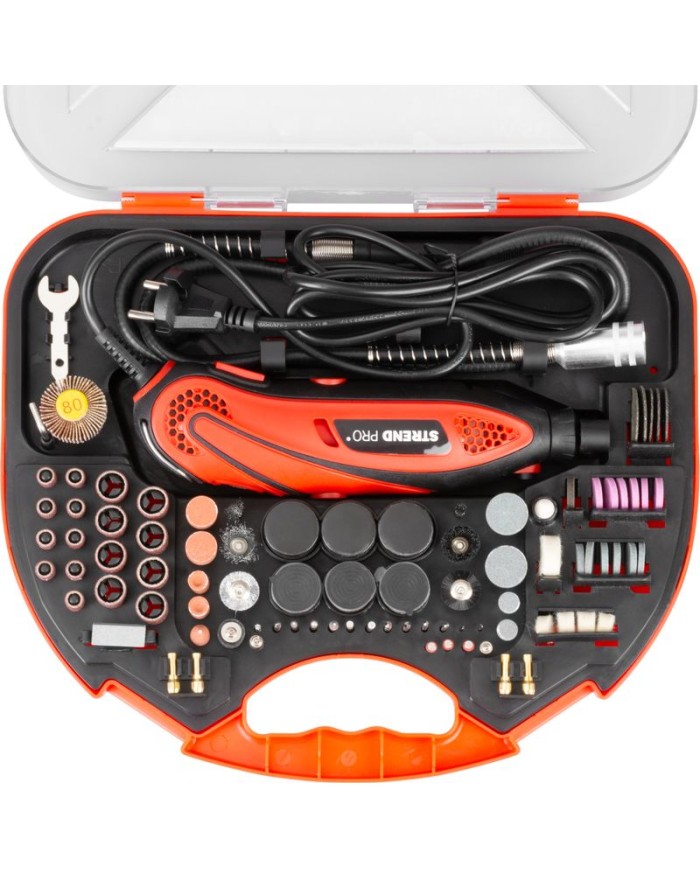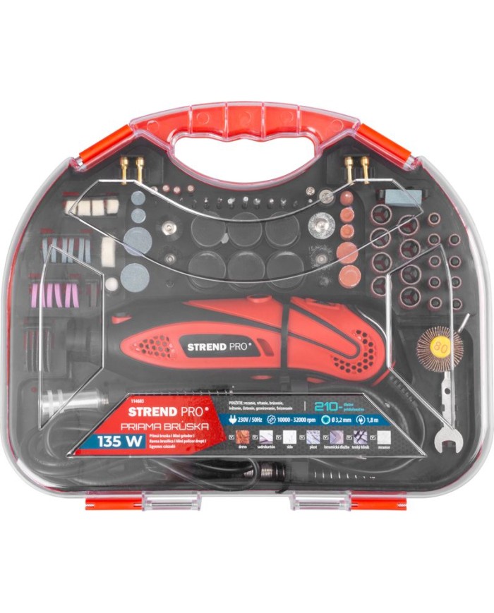 Priama brúska Strend Pro sa používa na detailné obrábanie kovov, plastov, dreva a podobných materiálov s použitím vhodného obrábacieho nástavca. Sada obsahuje 210-dielne príslušenstvo: