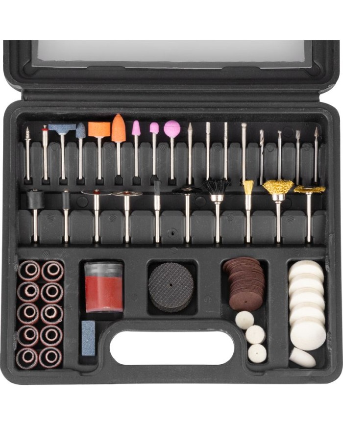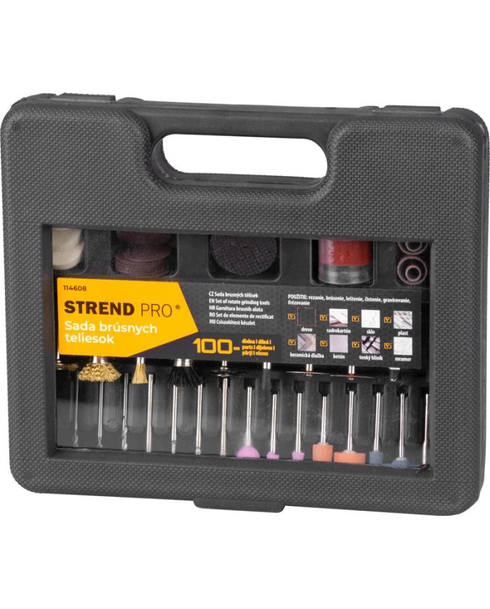 Sada brúsnych teliesok Strend Pro je vhodná pre mini brúsku na rezanie, vŕtanie, brúsenie, leštenie, čistenie, gravírovanie a frézovanie. Sada obsahuje: 1x brúsny kameň.Na frézovanie:6x HSS frézka.Čistenie:3x nylonová kefa, 3x mosadzná kefa.Na brúsenie:11x brúsne teliesko, 22x brúsny valček.Na rezanie:31x korundový rezný kotúč, 1x stopka, 5x rezný kotúč.Na leštenie:1x leštiaca pasta, 1x stopka, 15x plstený kotúč. Spolu obsahuje až 100 brúsnych teliesok.