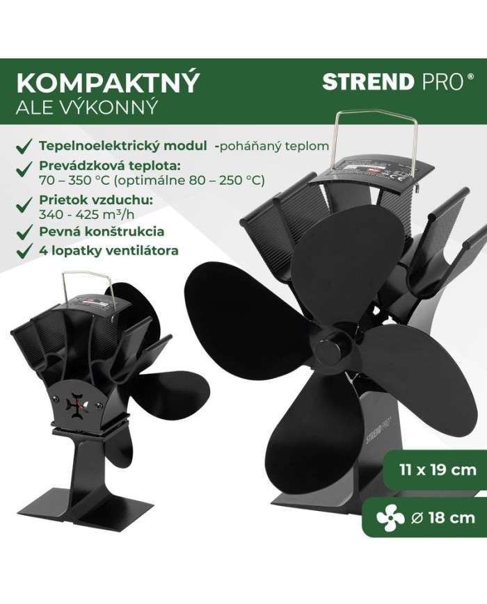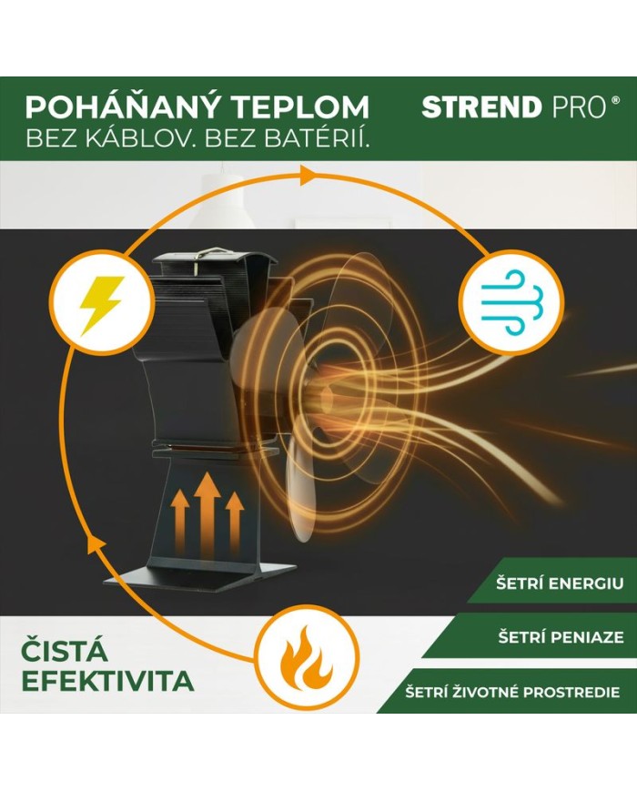 Krbový ventilátor Strend Pro je praktické a ekologické zariadenie určené na zefektívnenie rozptylu tepla z krbových kachlí alebo krbových vložiek. Vďaka termoelektrickému pohonu nevyžaduje pripojenie do elektrickej siete – energiu získava priamo z tepla krbu. Je ideálnym riešením pre domácnosti, ktoré hľadajú spôsob, ako zlepšiť cirkuláciu tepla, znížiť spotrebu paliva a zvýšiť tepelný komfort v miestnosti.