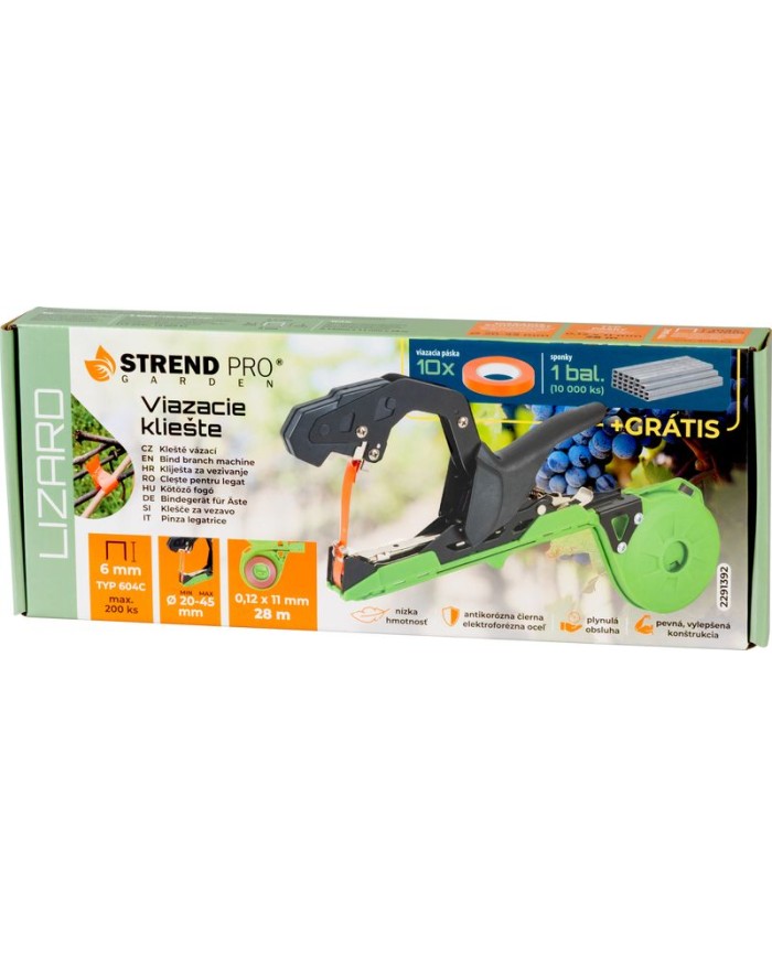 Viazacia sada Lizard obsahuje všetko, čo potrebujete na rýchle a efektívne viazanie rastlín v záhrade, viniciach alebo v sadoch. Sada zahŕňaprofesionálne viazacie kliešte,10 ks náhradných pásoka10 000 ks spôn, čo umožňuje dlhodobé a plynulé používanie bez potreby častého dopĺňania materiálu.