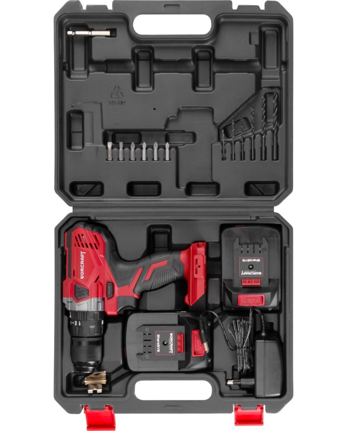 Skrutkovač je tiež vybavený LED osvetlením, kovovým skľučovadlom a ergonomickou, protišmykovou rukoväťou. Kompaktný háčik slúži na zavesenie skrutkovača na opasok. V praktickom kufríku nájdete skrutkovač Worcraft CHD-S20LiWB, 2x akumulátor 2.0Ah, 1x nabíjačku, 6 ks vrtákov do kovu, 6 ks bit a 1 ks adaptér