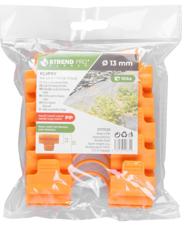Oranžové klipsy Strend Pro s priemerom 13 mm sú ideálnym riešenímna pevné uchytenie fólie na pareniská alebo fóliovníky. Sú vyrobené z odolného materiálu PP, ktorý zabezpečuje dlhú životnosť a spoľahlivú funkčnosť.