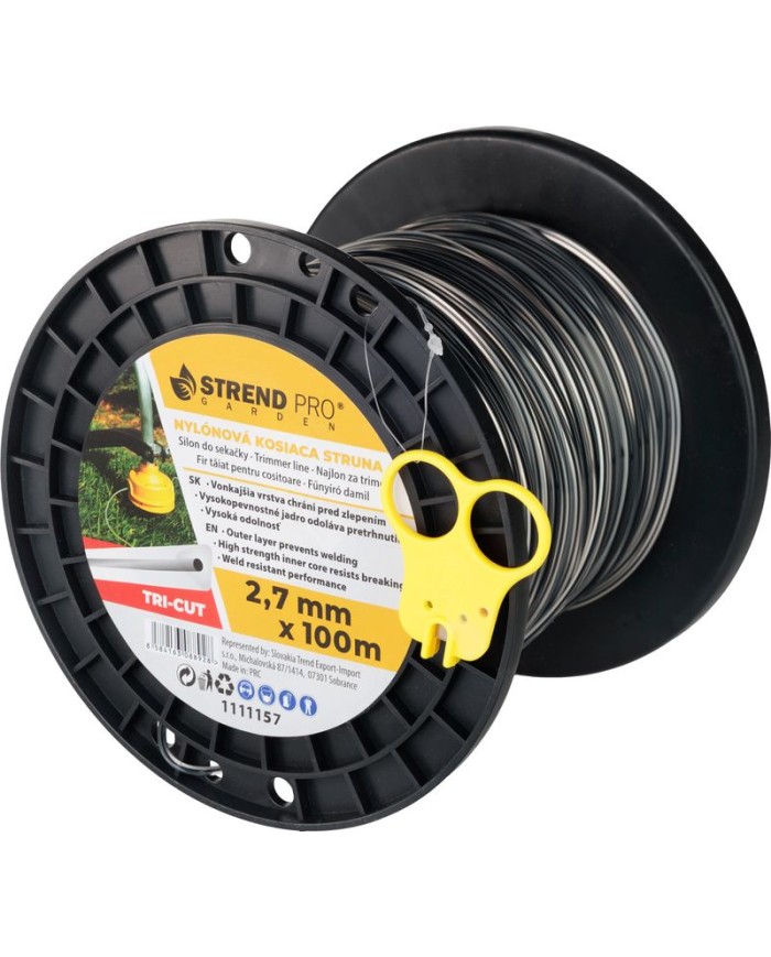Nylónová kosiaca struna Strend Pro TriCut má vysokopevnostné jadro, ktoré odoláva pretrhnutiu. Vonkajšia vrstva chráni pred zlepením. Je vyrobená z vysokopevnostných plastov. Vhodný na rýchle kosenie aj vyššej trávy. Dĺžka je 100 metrov, šírka 2,7 mm.
