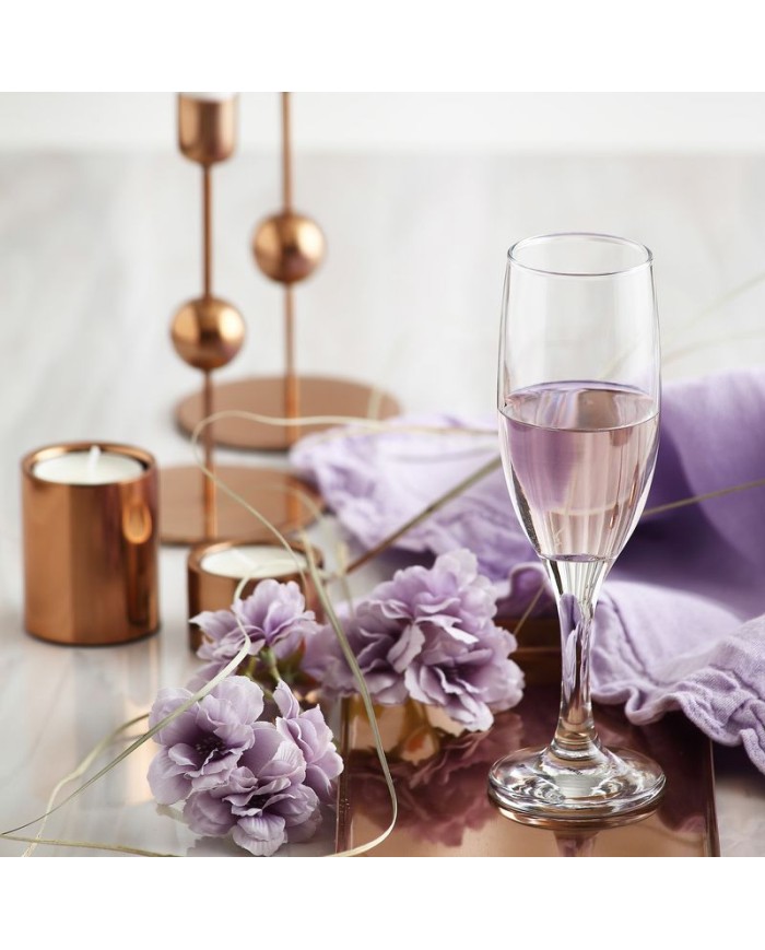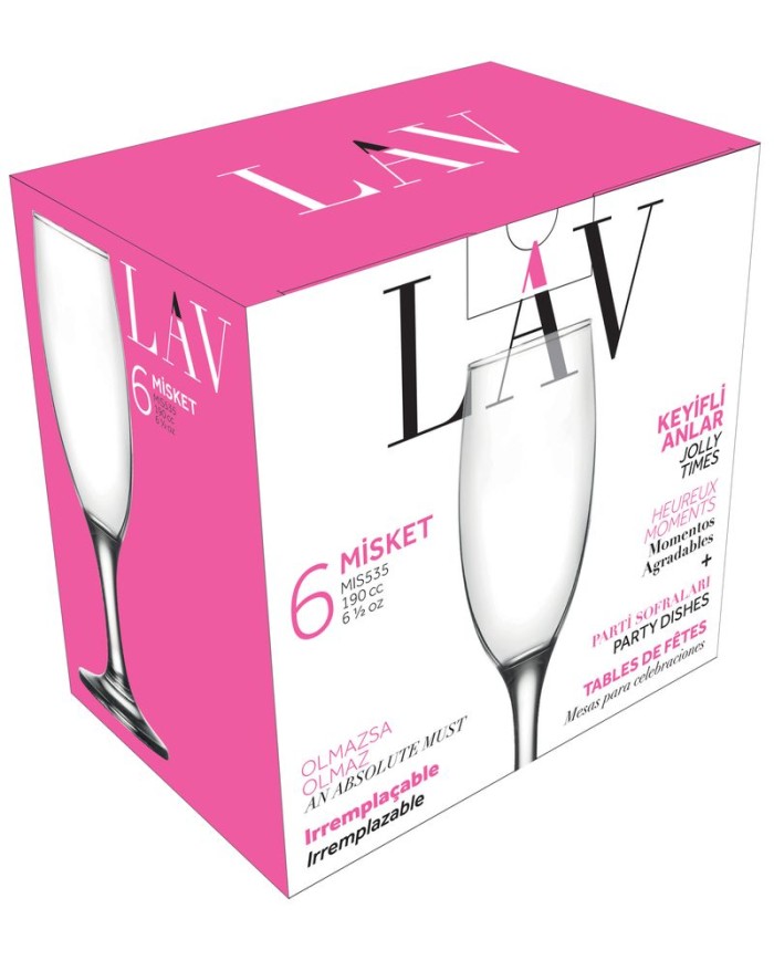 Sada obsahuje 6 kusov elegantných pohárov Misket, so stopkou. Poháre sú vyrobené z číreho skla. Využívajú sa na podávanie šampanského. Rozmery pohárov sú 50x193 mm a objem 190 ml