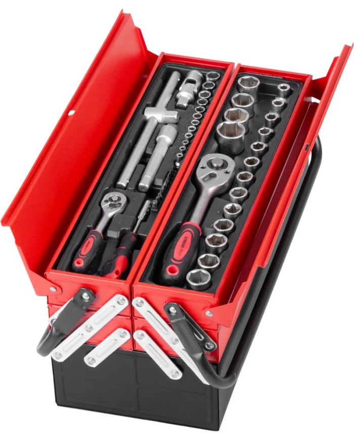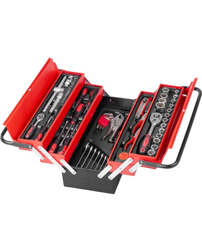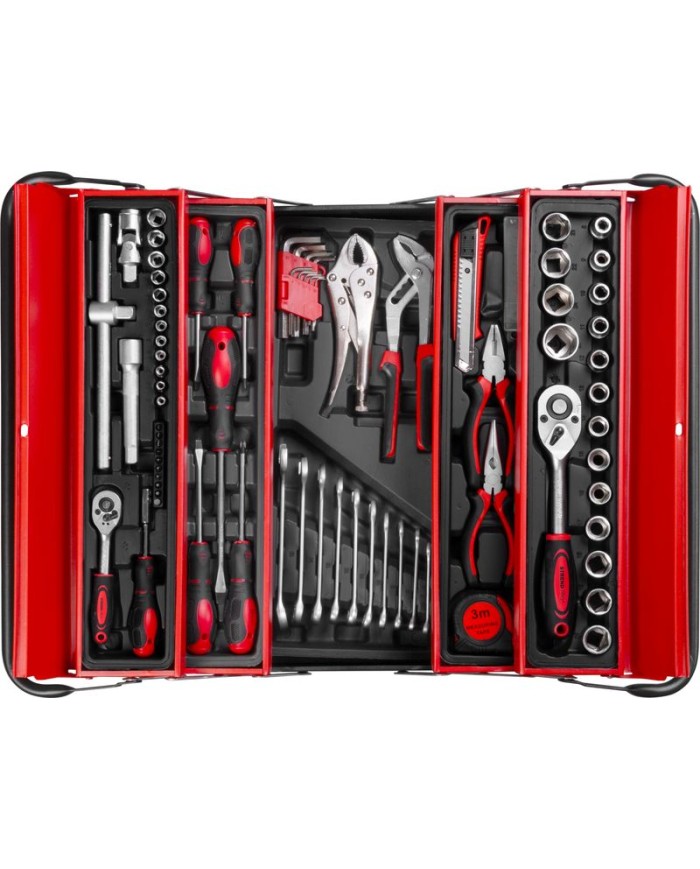 Táto sada obsahuje široký výber kvalitného náradia, od hlavíc a kľúčov až po skrutkovače a kliešte,všetko prehľadne usporiadané pre jednoduchý prístup a prenosnosť.Či už ste domáci majster alebo profesionál, táto sada sa stane nepostrádateľným pomocníkom vo vašej dielni.