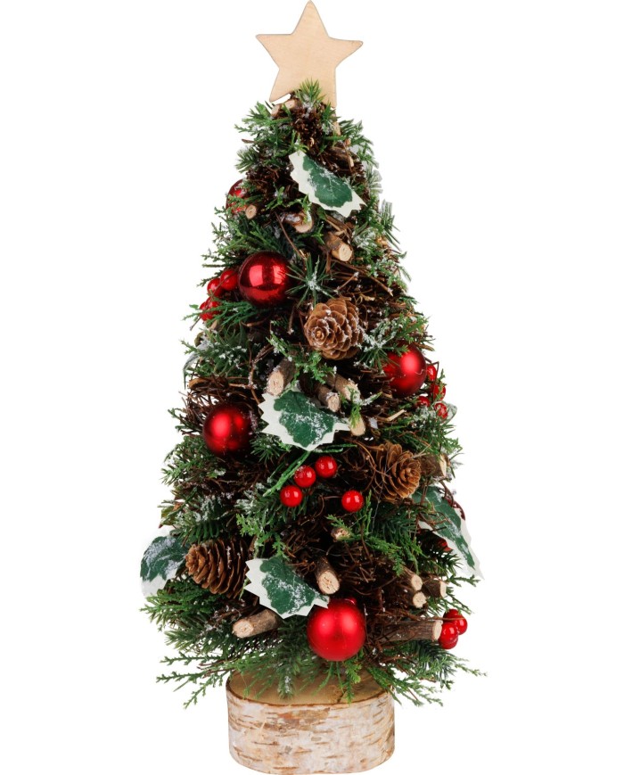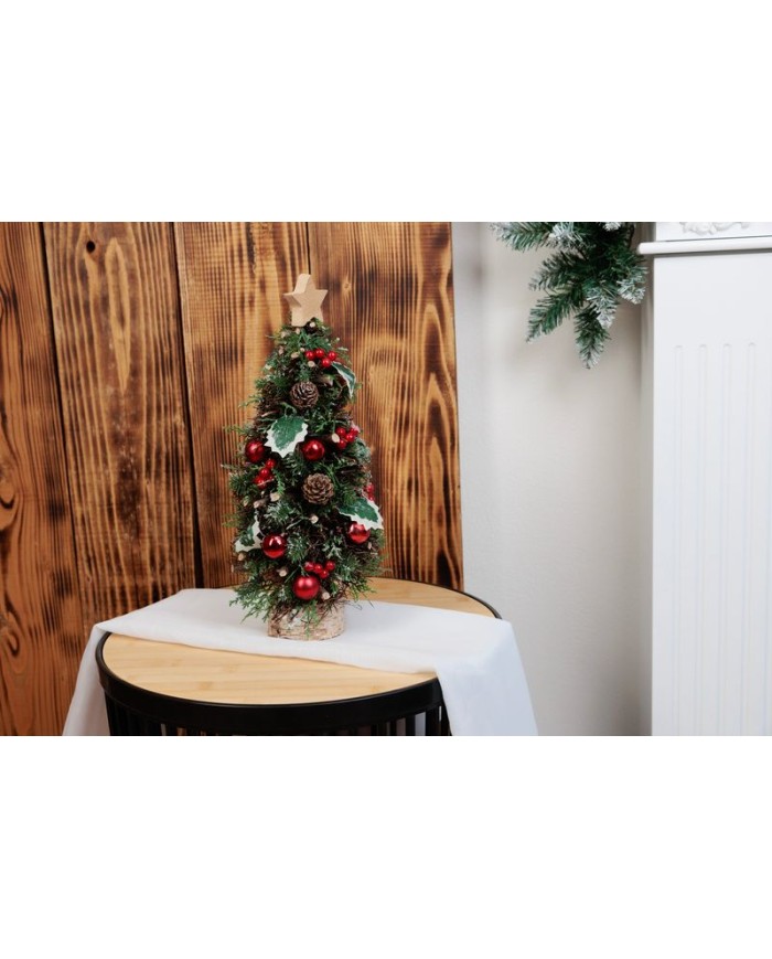 Pridajte sviatočný šarm do vášho interiéru s týmto malým vianočným stromčekom na podstavci. S výškou 40 cm a základňou s praktickými rozmermi 18x18 cm, tento stromček je ozdobený elegantnou hviezdou na vrchole, čo mu dodáva špeciálny vianočný nádych. Ideálny na stôl alebo menšie plochy.