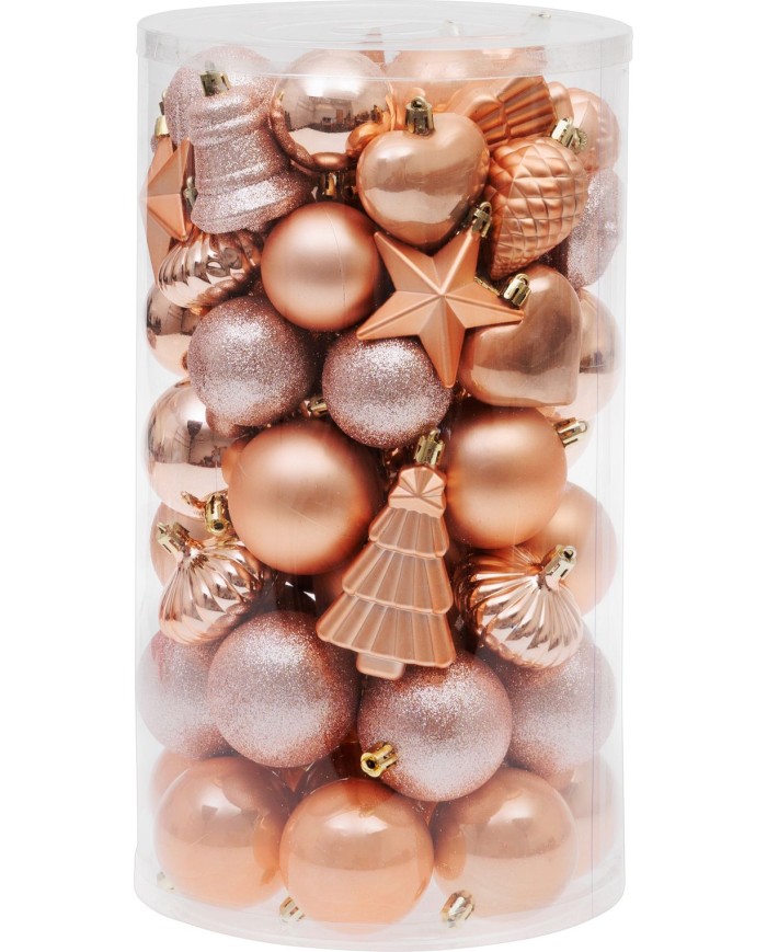 Súprava ozdôb na stromček slúži na slávnostné ozdobenie vianočného stromčeka. Pozostáva z 65 ks rôznych vianočných ozdôb. Ozdoby sú ružovej a zlatej farbý a sú vyrobené z plastu.
