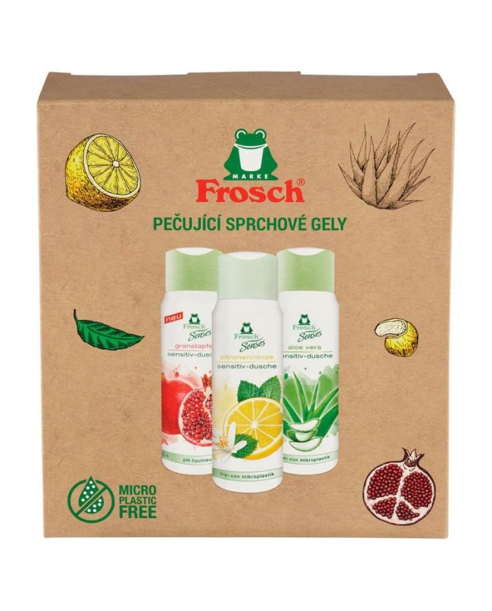 Darčekovou súpravou Frosch potešíte nielen svojich blízkych, ale aj prírodu. Produkty so zelenou žabičkou na obale sú priateľské k našej pokožke aj životnému prostrediu vďaka šetrnému a v prírode odbúrateľnému zloženiu, ekologickej výrobe i recyklovaným a opätovne recyklovateľným obalom. Výrobky sú vegánske.