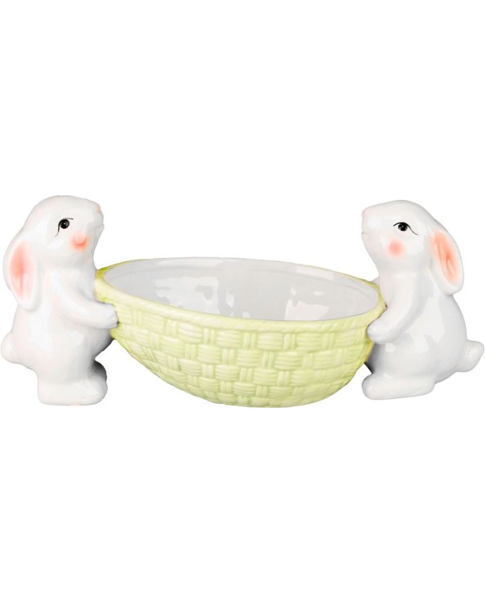 Táto keramická dekorácia MagicHome v podobe dvoch roztomilých zajačikov držiacich misku na vajíčka je krásnym doplnkom na veľkonočný stôl alebo jarnú výzdobu. V elegantnej bielej farbe a rozmeroch 12 × 26,5 × 11 cm pôsobí štýlovo a vkusne zapadne do každého interiéru. Miska poskytuje priestor na uloženie veľkonočných vajíčok, sladkostí alebo drobných dekorácií. Kvalitné keramické spracovanie zaručuje odolnosť a dlhú životnosť. Perfektná dekorácia, ktorá prinesie do vášho domova sviežu jarnú atmosféru.