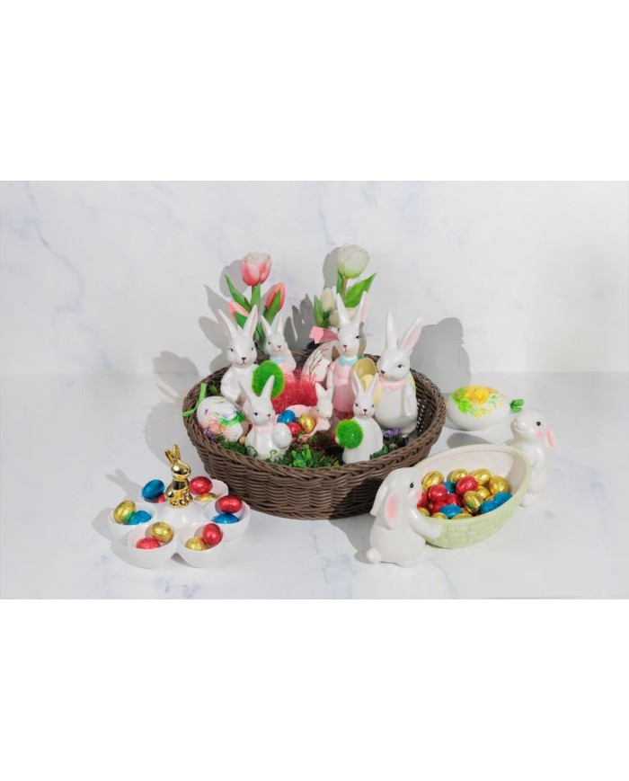 Dekorácia MagicHome, Zajačiky s miskou na vajíčka, biela, 12x26,5x11 cm