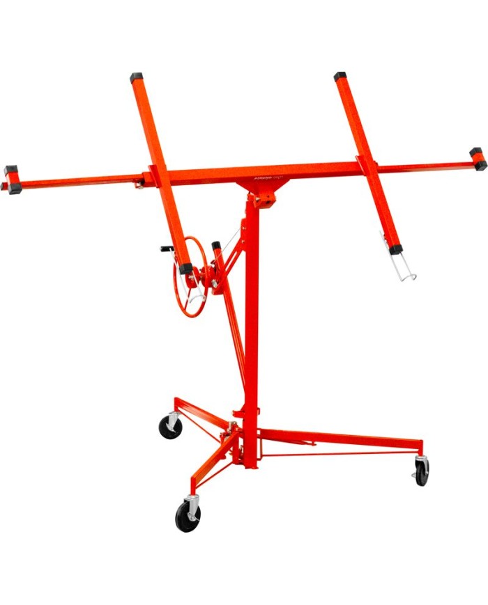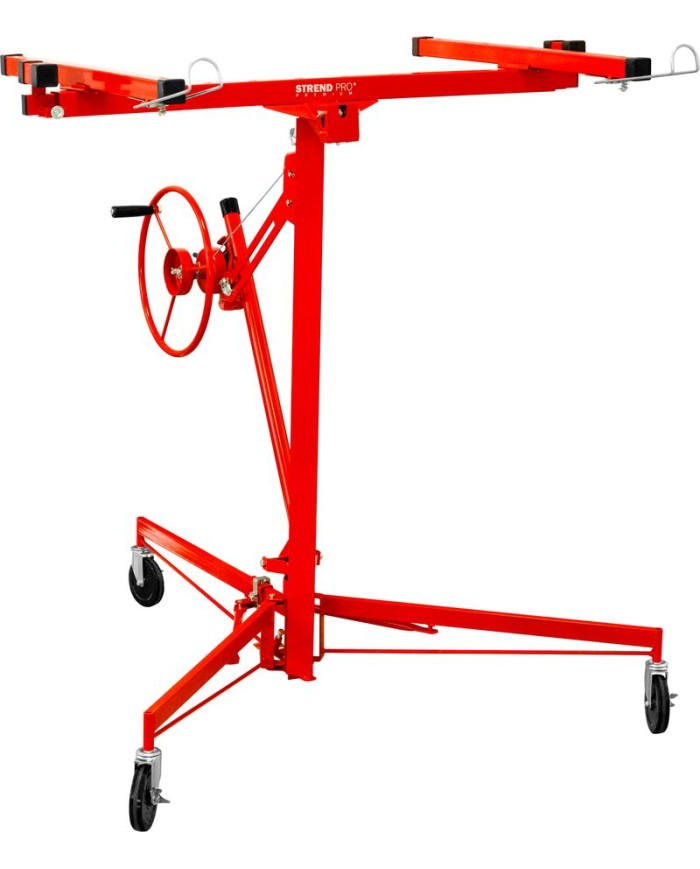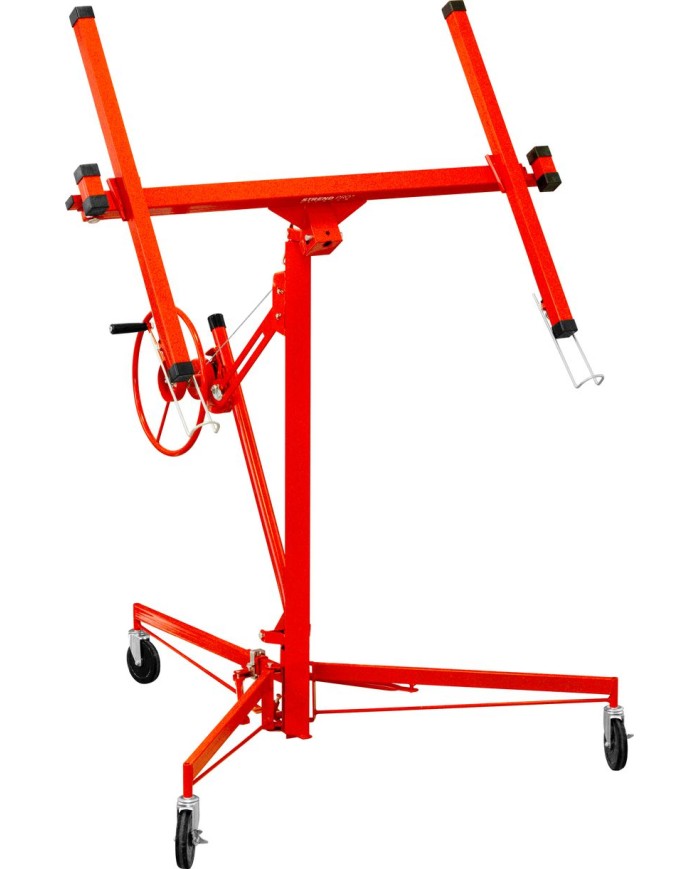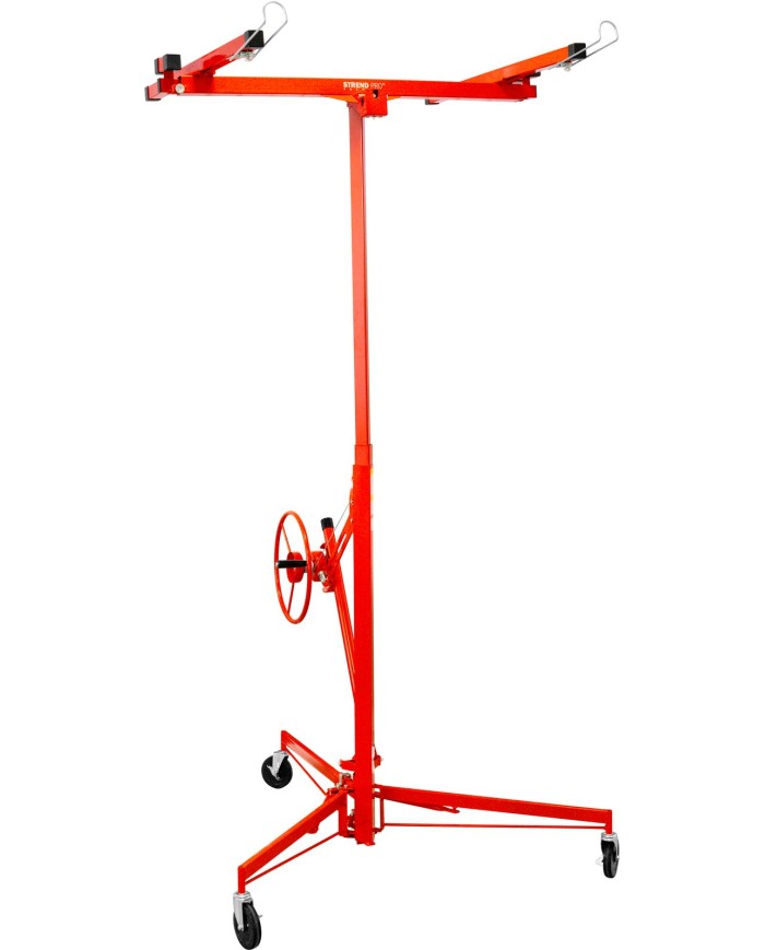 Zdvihák sadrokartónových dosiek Strend Pro je praktický a spoľahlivý pomocník na montáž sadrokartónu na stropy, steny či šikmé plochy. Vďaka nastaviteľnej výške až 3,35 m (až 4,7 m s predĺžením) a otočnému rámu umožňuje pohodlnú manipuláciu aj s veľkoformátovými doskami až do rozmeru 122 × 487 cm.