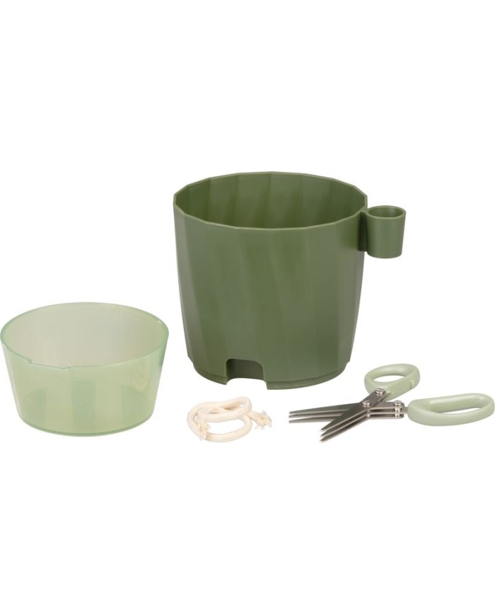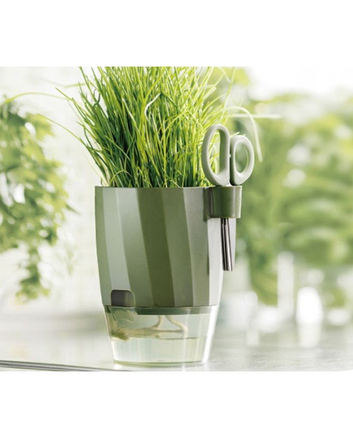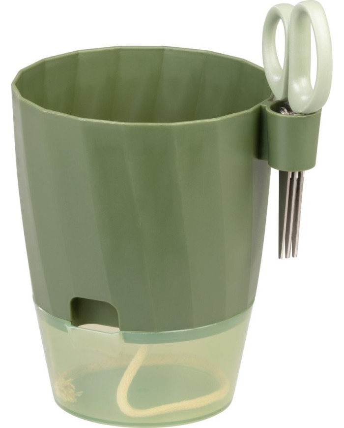 Vyrobený je zkvalitného plastu, ktorý je ľahký, odolný a ľahko sa čistí. Kvetináč obsahujeintegrovaný držiakna malézáhradnícke nožnice, ktoré sú súčasťou balenia a uľahčujú pravidelné zastrihávanie byliniek a rastlín priamo pri pestovaní.