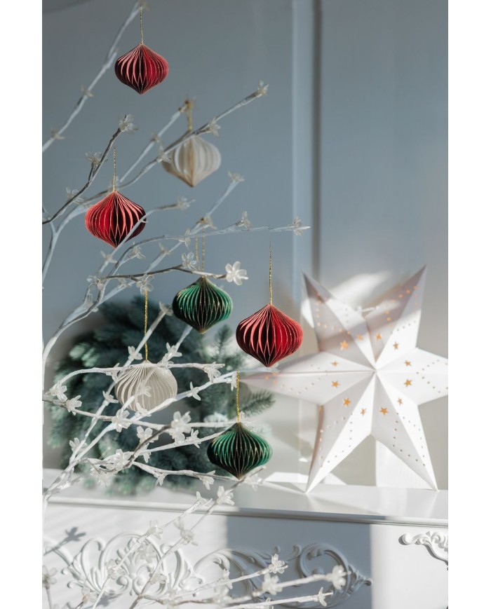 Štýlové vianočné ozdoby v tvare gúľ dodajú vášmu stromčeku elegantný a moderný vzhľad. Tieto papierové dekorácie sú vyrobené z kvalitného ručného papiera, ktorý im dodáva pevnú štruktúru a zároveň jemný, prírodný vzhľad.