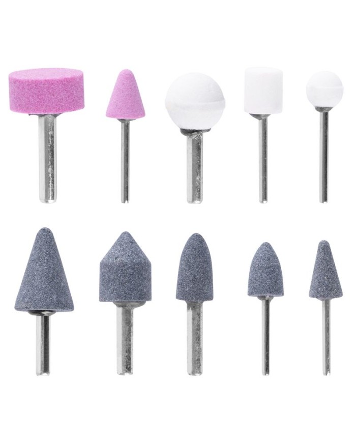 Sada brúsnych teliesok Strend Pro by nemala chýbať vo výbave profesionálnych remeselníkov, ale aj domácich kutilov. Pozostáva z 10 teliesok so stopkou, ktoré sú vhodné do vŕtačky na brúsenie a vyrezávanie.