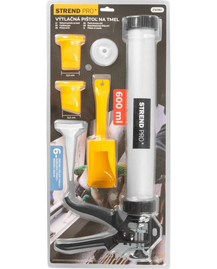 Sada Strend Pro obsahuje profesionálnu výtlačnú pištoľ výtlačná s nadstavcami, ktoré umožňujú jednoduchú a presnú aplikáciu tmelov, silikónov či lepidiel. Pištoľ je určená pre 600 ml náplne a vďaka kvalitnému spracovaniu zaisťuje spoľahlivú a pohodlnú prácu aj pri dlhodobom používaní.