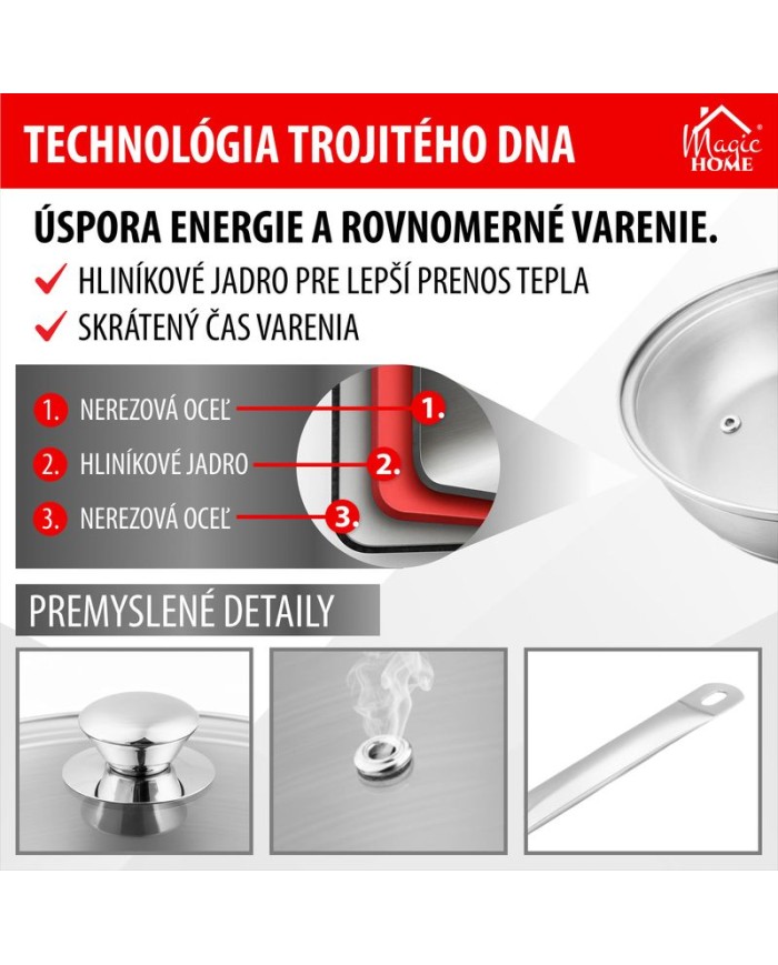 - Trojité dno: Vďaka hliníkovémujadru v trojitom dne sa teplo rovnomerne rozkladá po celej ploche nádoby, čo umožňuje efektívne varenie bez pripaľovania.Tento systém zároveň znižuje spotrebu energie, čo je šetrné k životnému prostrediu aj vašej peňaženke.