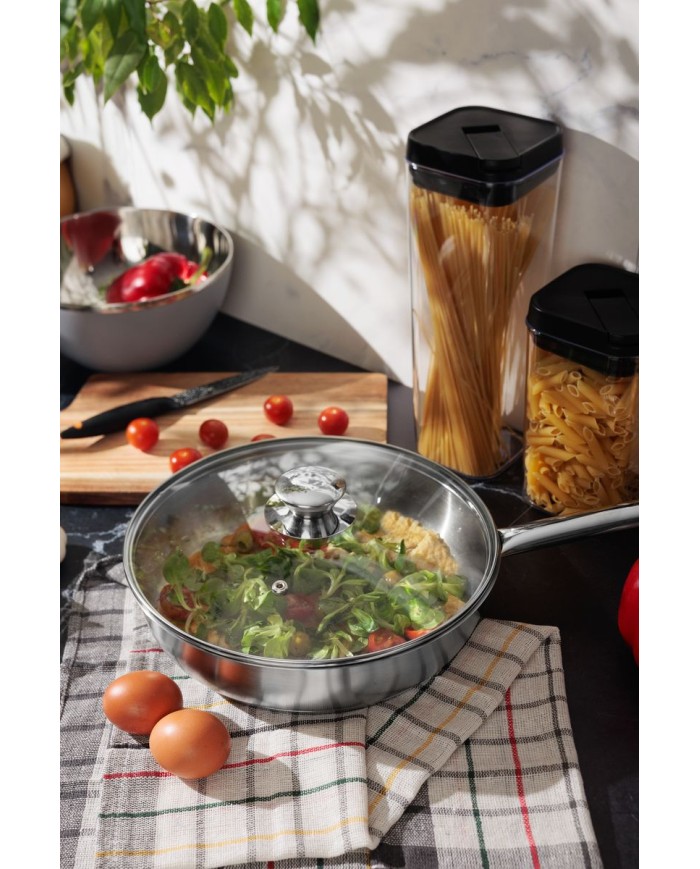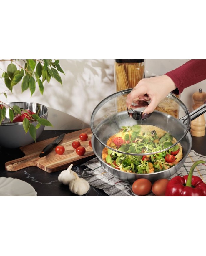 - Bezpečnosť a komfort: Pohodlná rukoväť zabezpečuje pevný úchop a jednoduchú manipuláciu aj pri vysokých teplotách.Sklenená pokrievkaumožňuje kontrolovať proces varenia bez potreby jej odklápania.