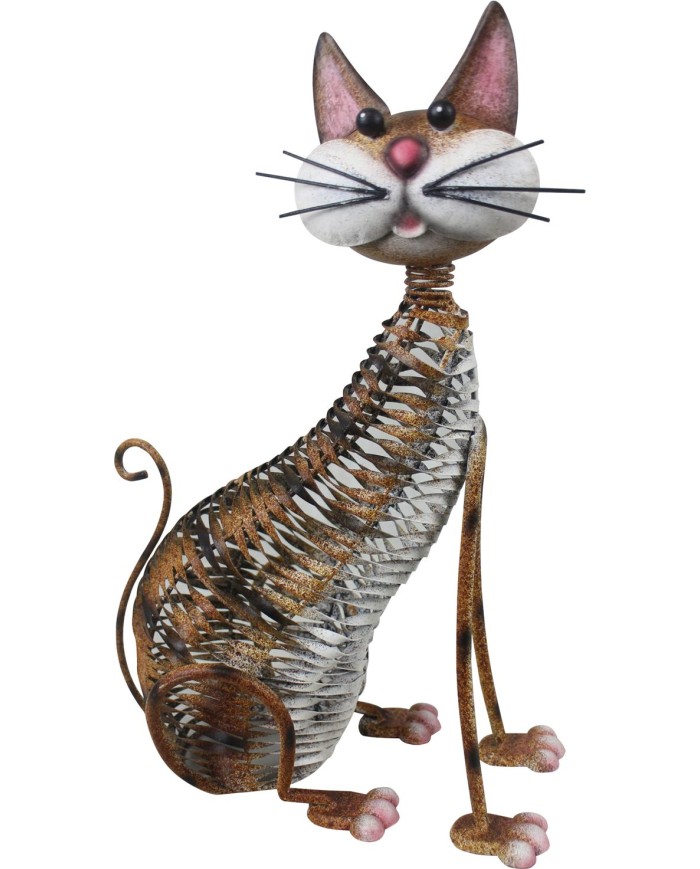 Vyrobená zodolného kovu, táto mačka mádetailne prepracovanú štruktúru telas jemnými kovovými výrezmi, ktoré imitujú srsť a dodávajú jej vzdušný vzhľad. Jejveľké okrúhle oči, výrazné fúziky, ružový noštek a stočený chvostjej dodávajú rozkošný a priateľský charakter.