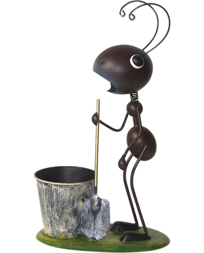 Vyrobený zodolného kovu, tento roztomilý mravec máveľké oči, zakrivené tykadlá a otvorený úsmev, čo mu dodáva hravý a dynamický vzhľad. V jednej ruke držízlatý rýľ, pričom vedľa neho jeplechový kvetináč v patinovanom štýle, ideálny na malé rastliny, bylinky alebo dekorácie.