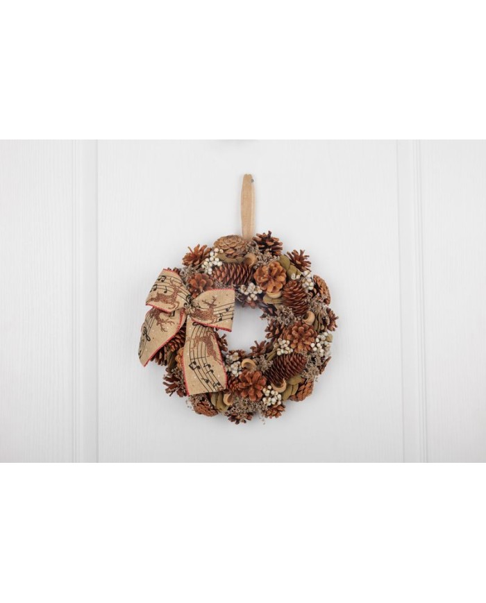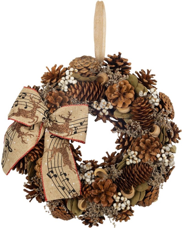 Dekor je doplnený ozdobnou mašľou s hudobným motívom, ktorá dodáva vencu originálny a tradičný vzhľad. Veniec má praktické pútko na zavesenie, takže ho jednoducho umiestnite na dvere, stenu alebo okno.