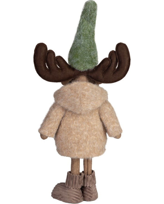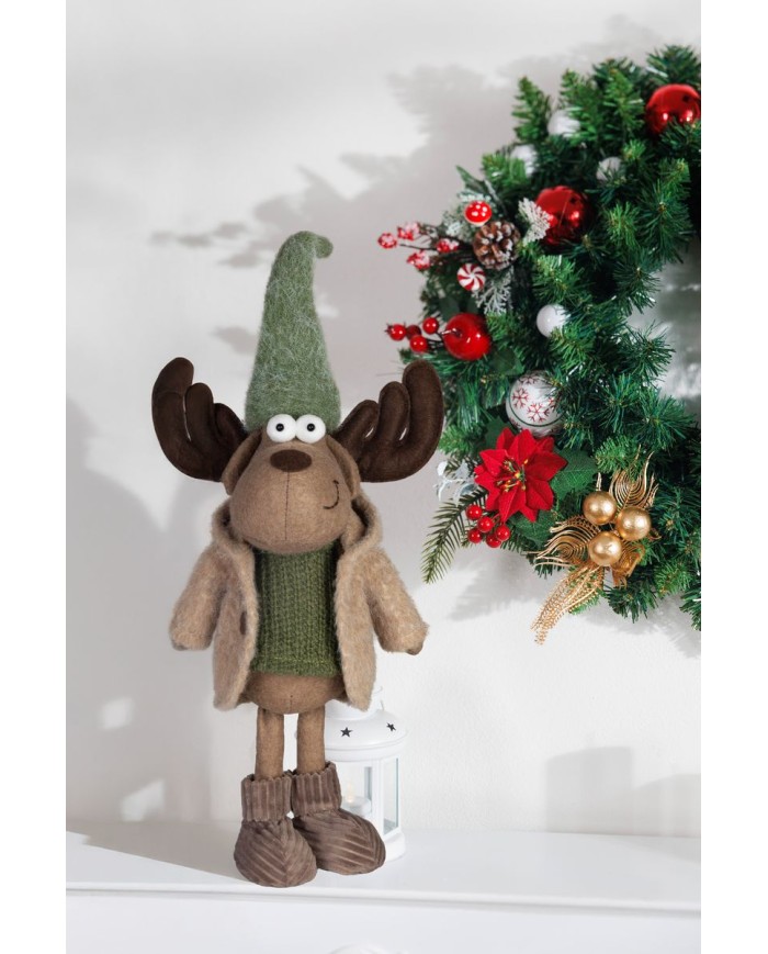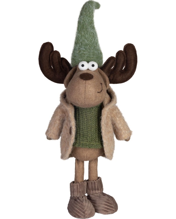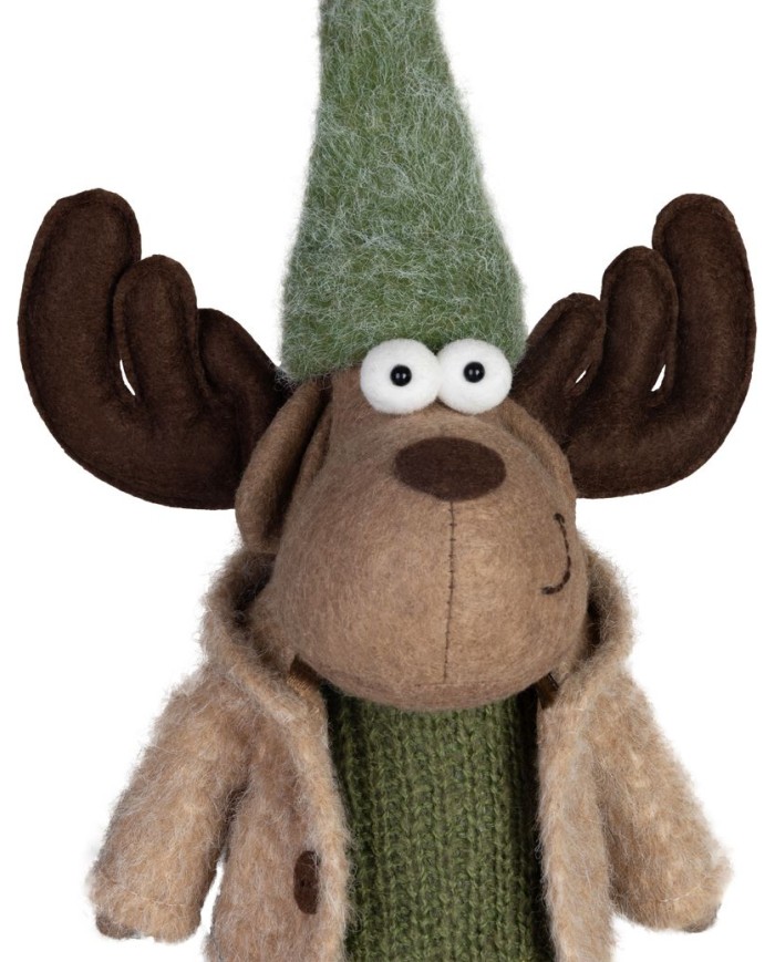 Sob je oblečený v zelenom svetríku, sukni a šále, doplnený výraznými parohmi a veselým výrazom. Jeho dizajn pôsobí hravo a štýlovo, čo ho robí ideálnym doplnkom do tradične i moderne ladených interiérov.