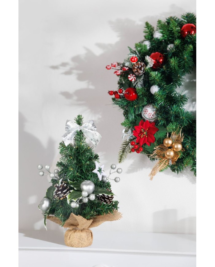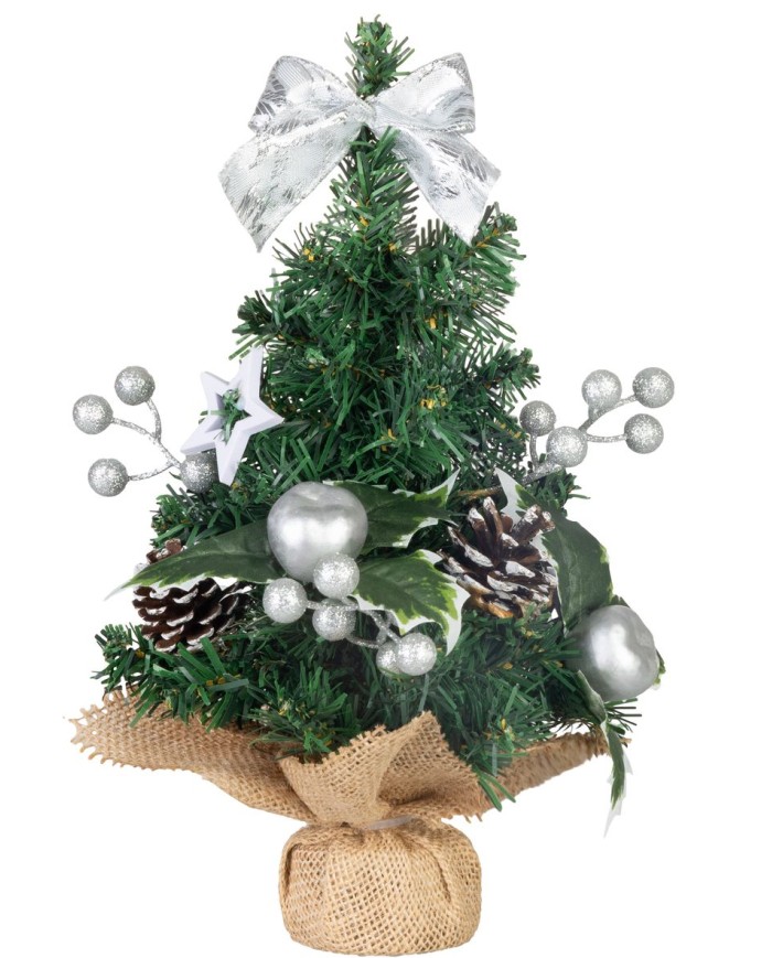 Dekorácia MagicHome Vianoce, stromček, 30 cm je štýlovým doplnkom, ktorý navodí sviatočnú atmosféru v každom interiéri. Malý vianočný stromček je zdobený striebornými ozdobami, šiškami a elegantnou mašľou, vďaka čomu pôsobí prirodzene a zároveň slávnostne. Jeho kompaktná veľkosť ho predurčuje na umiestnenie na stôl, policu alebo do okna, kde sa stane neprehliadnuteľným prvkom vašej výzdoby. Vďaka stabilnému podstavcu v jutovej úprave je stromček nielen praktický, ale aj estetický.