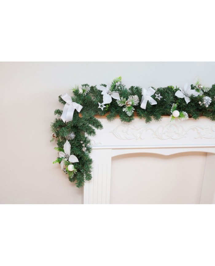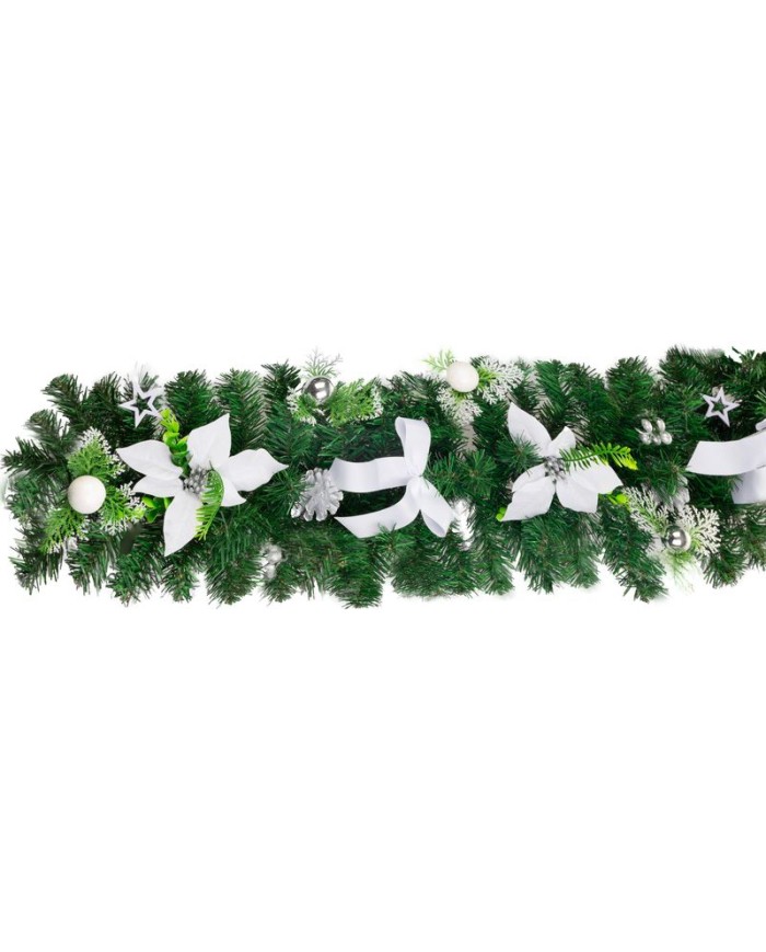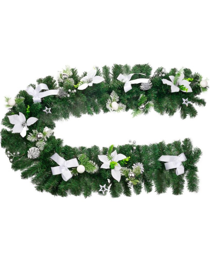 Vytvorte vo svojom domove sviatočnú atmosféru s elegantnou girlandou MagicHome Vianoce. Táto bohatá zelená girlanda je zdobená bielymi kvetmi, ozdobnými guľami, hviezdami a detailmi, ktoré podčiarkujú zimný nádych dekorácie.