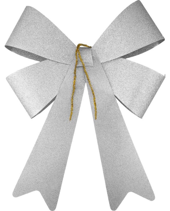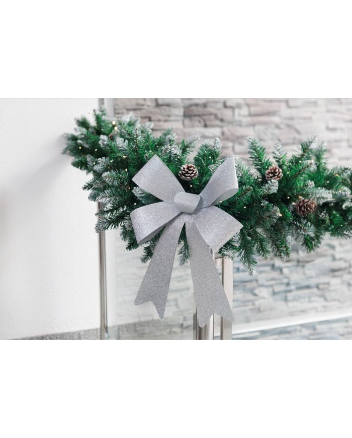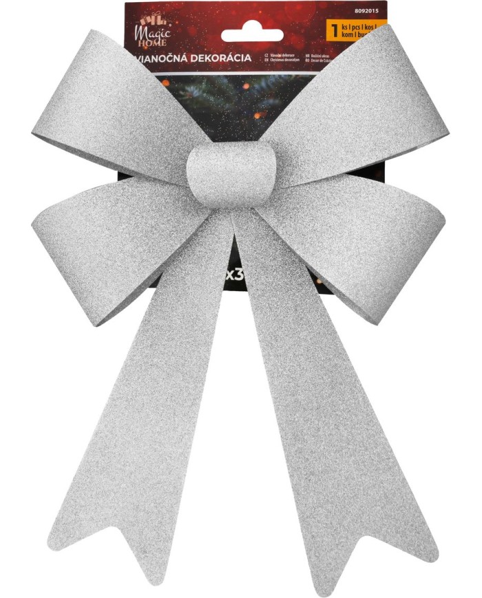 Dekorácia MagicHome Mašľa na vianočný veniec z trblietavého materiálu, ktorá rozžiari interiér vášho domu. Môže sa použiť aj na vianočnú girlandu. Farba mašle je strieborná a má rozmer 38 x 30 cm.