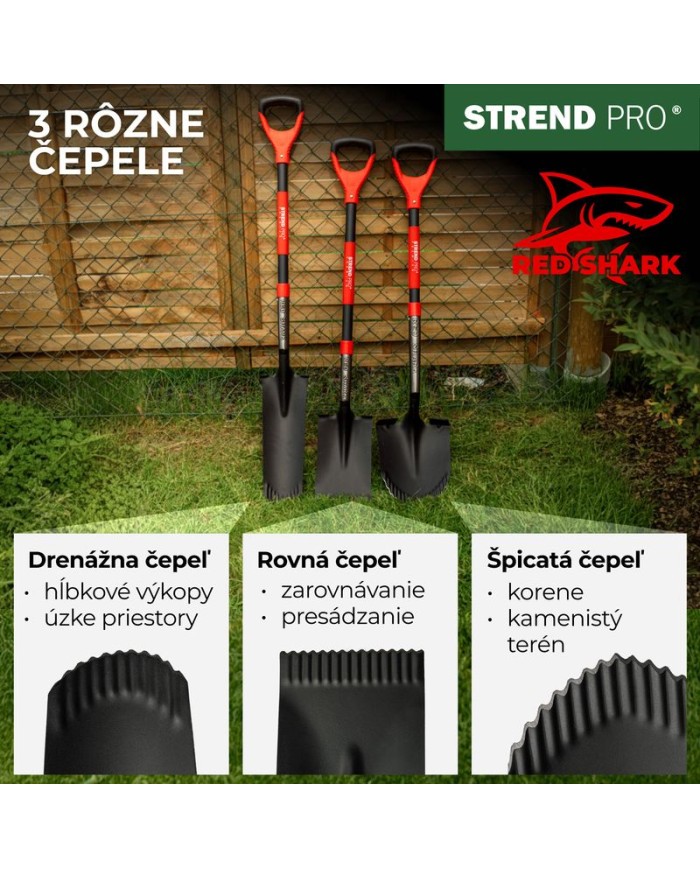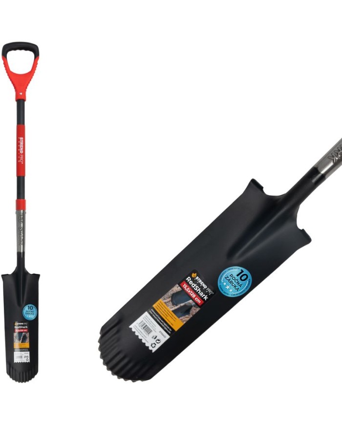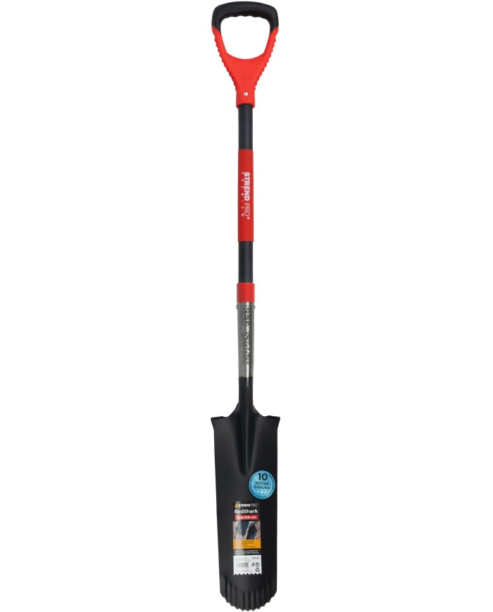 Úzky drenážny rýľStrend Pro Premium RedSharksručne ostrenými zubamina konci čepele je špecializovaný nástroj navrhnutý na kopaniehlbokých a úzkych výkopov– ideálny na drenážne práce, výsadbu stĺpikov, zavlažovanie alebo pokládku káblov a rúr. Vybavenýpevnou sklolaminátovou násadou s D-rukoväťous dĺžkou1280 mmposkytuje výbornú páku, stabilitu a pohodlné ovládanie aj pri práci v hĺbke.