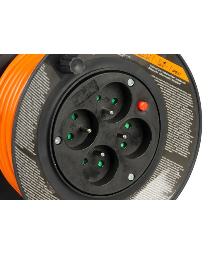 Kvalitný predlžovací kábel Strend Pro DG-FB04 v oranžovom prevedení namotaný na bubne je dlhý 15 metrov. Efektívne rozšíri prívod elektriny do vzdialených miest. Na bubne má štyri zásuvky (230 V), takže môžete napájať viacero zariadení naraz. Skvelo sa hodí do domácnosti alebo záhrady. Kábel je vhodný pre maximálnu zaťaž až do 3 000 W/16A , v prípade že je úplne rozvinutý. Maximálna záťaž pri navinutom kábli je 1200 W/16 A. Kábel má vodiče s prierezom 1,5mm.