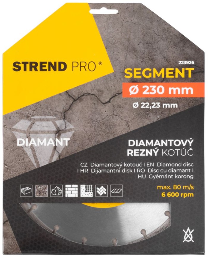 Diamantový kotúč Strend Pro je vhodný pre domácich kutilov, ale aj pre profesionálnych remeselníkov. Vhodný je na suché rezanie. technológia SEGMENT poskytuje najvyššiu rýchlosť a výborné chladenie kotúča. Má široké použitie - betón, žula, kameň, murivo, tehly, železobetón a možno ho použiť na obklad, dlažbu a strešnú krytinu. Jeho priemer je 230 mm a maximálne povolené otáčky sú 6 600 rpm.